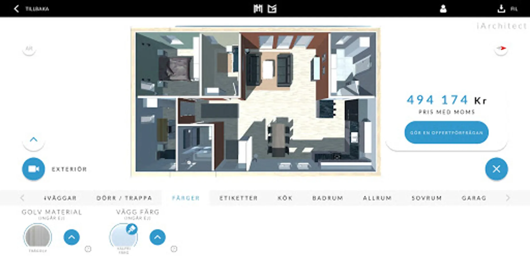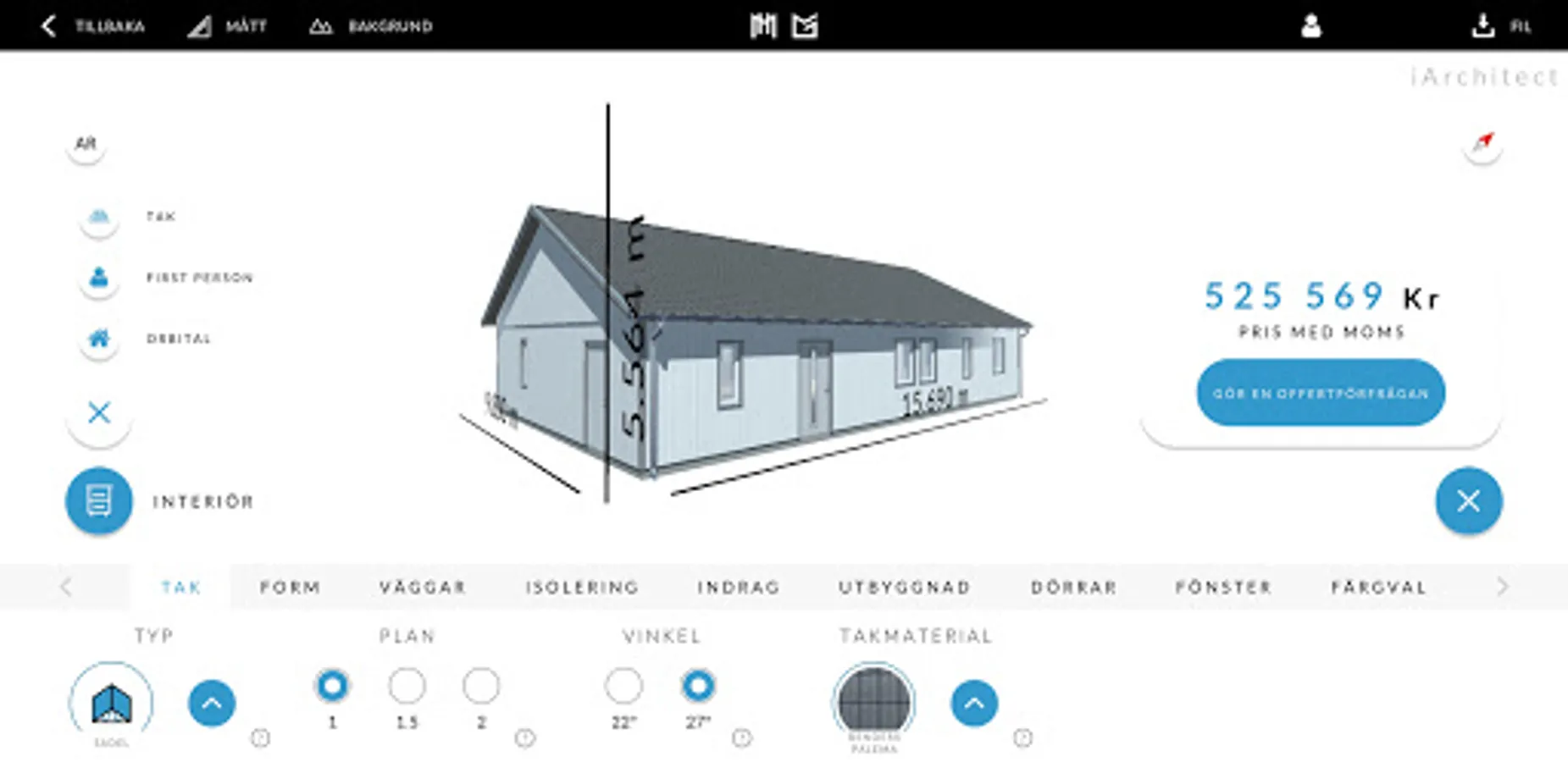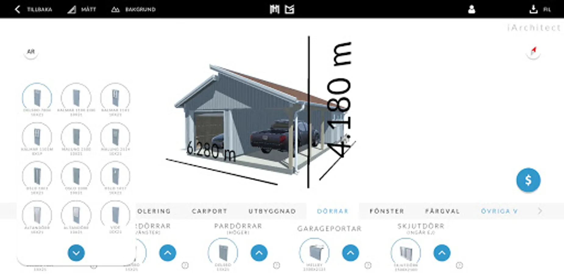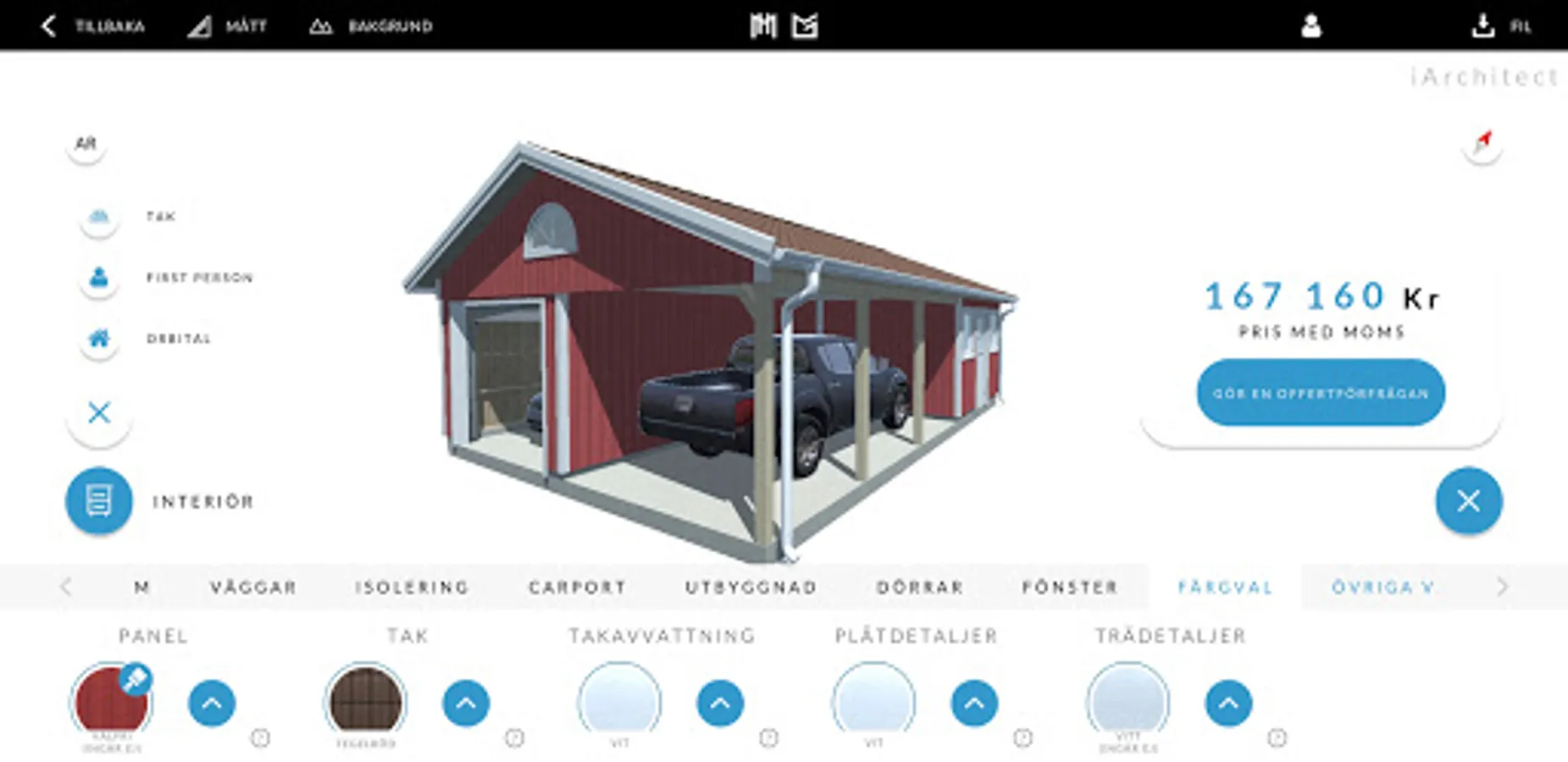 Build your house or garage from scratch in our app. Choose the type of building you want to create, choose dimensions, number of floors, type of roof, facade panel and change the colors of details. Place doors and windows with the simple drag-and-drop function. When you are done, you will see the price directly in the app.