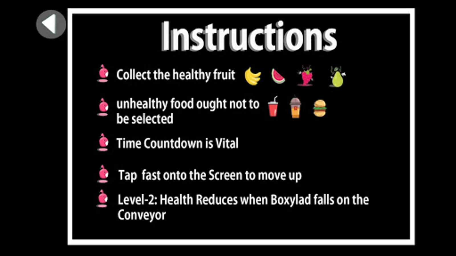 player. The player ought to jump across Junk food to maintain his health. When he consumes, his health declines. The conveyor keeps rolling and the player has to keenly choose the right content.