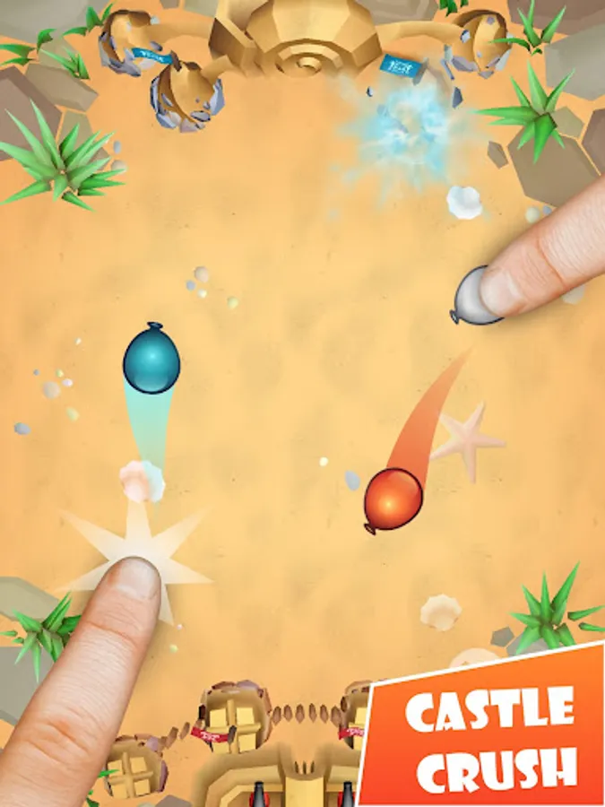 • Castle Crush is a pure reaction game — bomb your opponent's sand castle with water balloons and grab shovels to repair your own base. Keep an eye out for big balloons - they explode with a bang after three seconds!