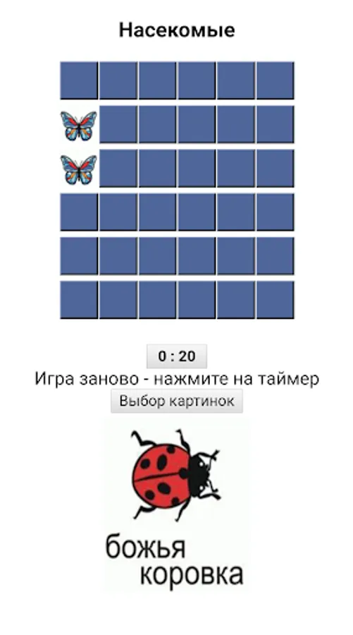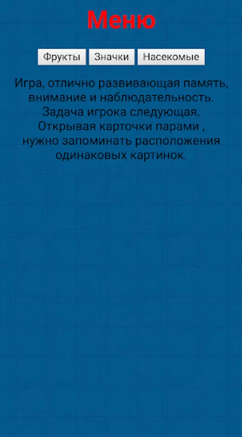 A game that perfectly develops memory, attention and observation. The player’s task is as follows. Opening cards in pairs, you need to remember the location of the same pictures.
