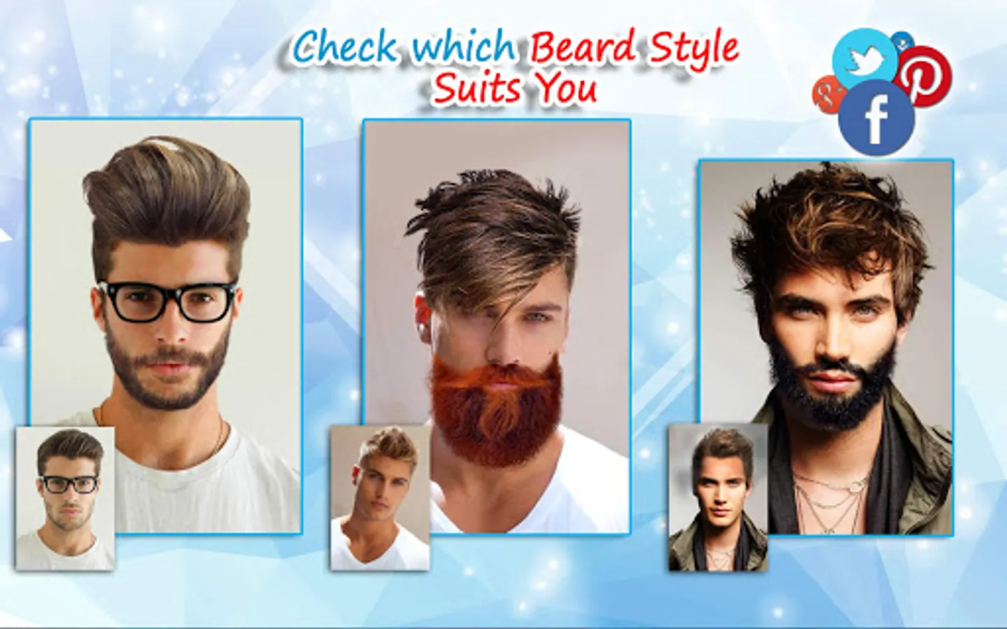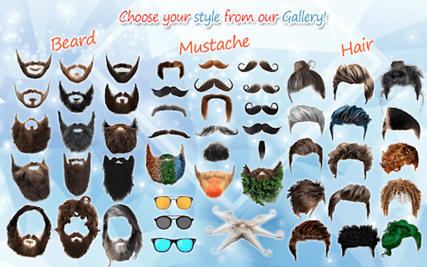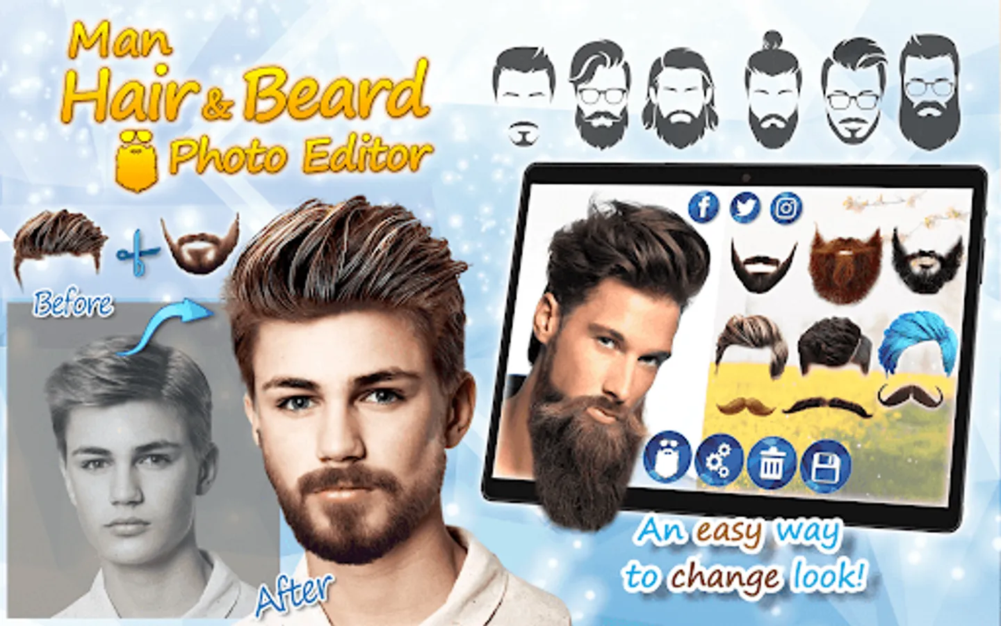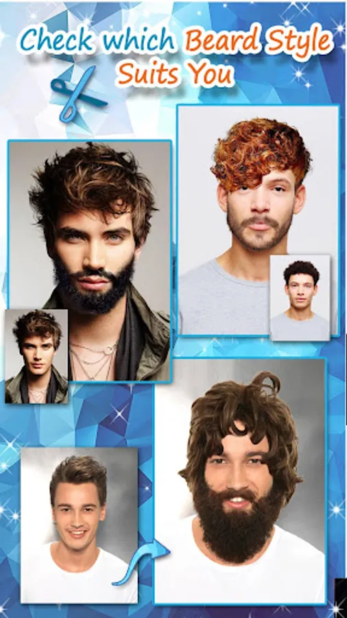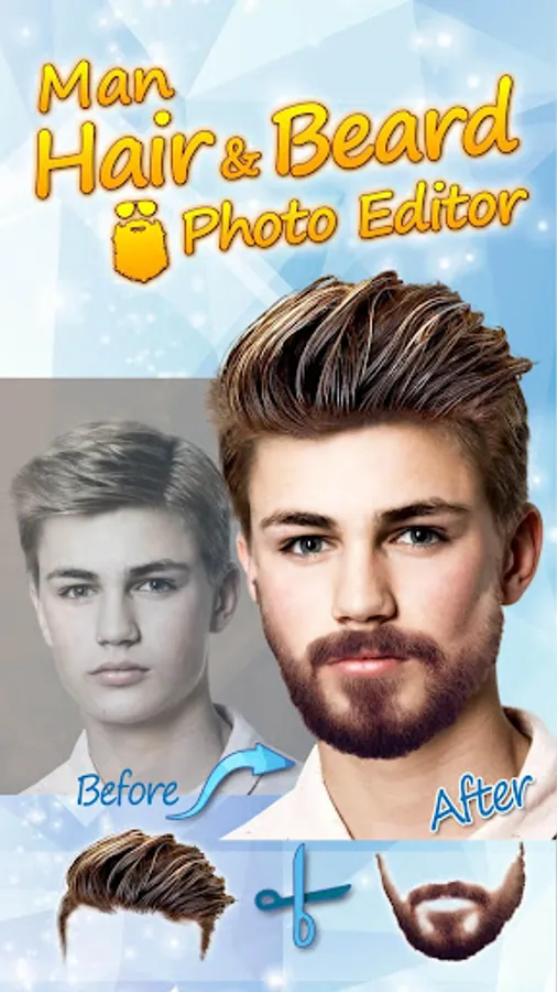 Do you like stickers, cool photography and hair editor app for men? Would you like man hair mustache style and to try beard style? We offer the photo maker and “men hair style photo editor”. It is called “Men Hairstyles” - “Beard Camera” and it's a cool app for everyone to try. Try photoediting men hairstyle and beard, use stickers to change men hair. Make cool photo montages easily. The photo software and men hairstyle app has indian men hair style, korean hair style for men and more. Download Men Hairstyles - Beard Camera, enjoy newest men hair styles. It is fun to “edit images” with this hair styler app for men in “photo editor”.