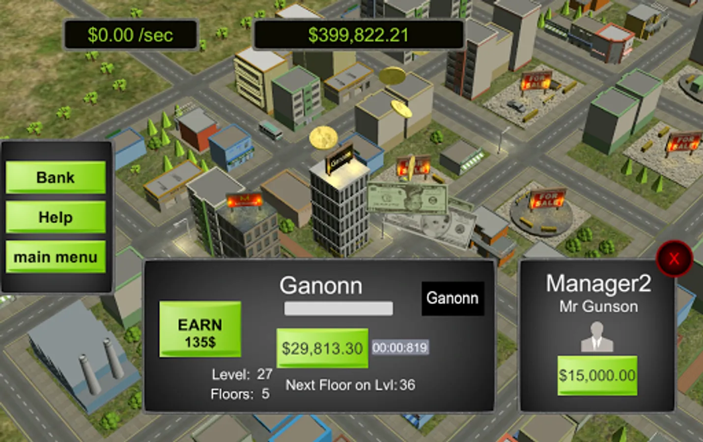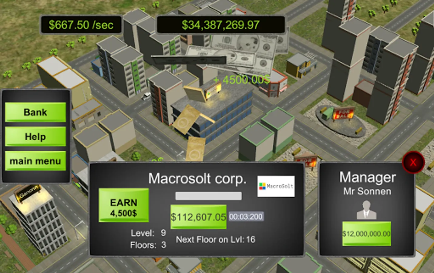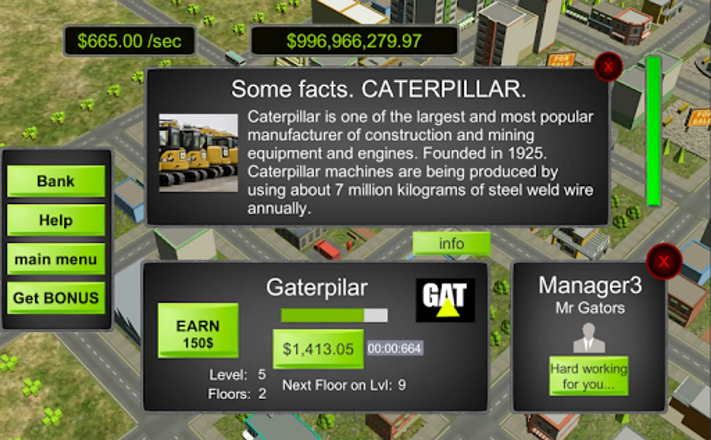 Corporation Magnate is a very special non-standard city-building tycoon, cash flow game and financial simulator. You can buy land, build new office buildings, hire managers. After being first manager, you may watch real-time "cashflow" as it is. It is counted in a real time. For example you make $1 game currency per second. So it would be calculated to year income as a S31 536 000. (31M seconds in a year). So you may watch approximately