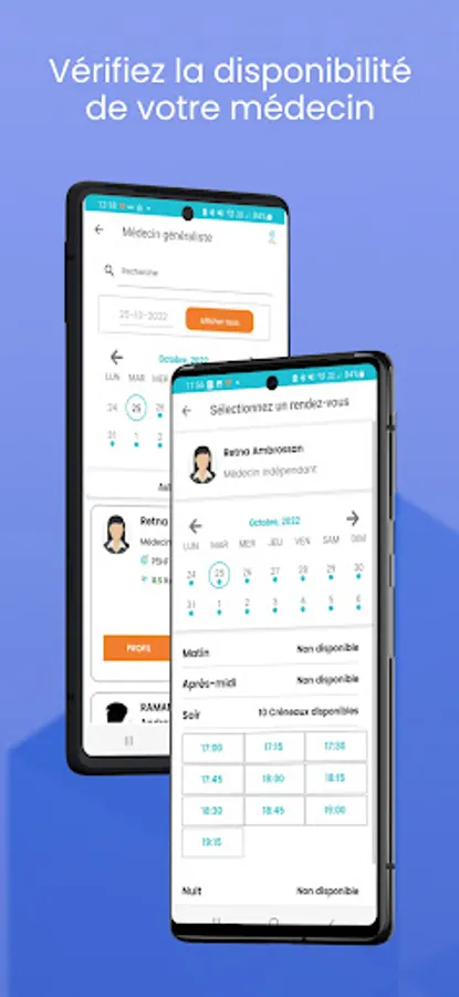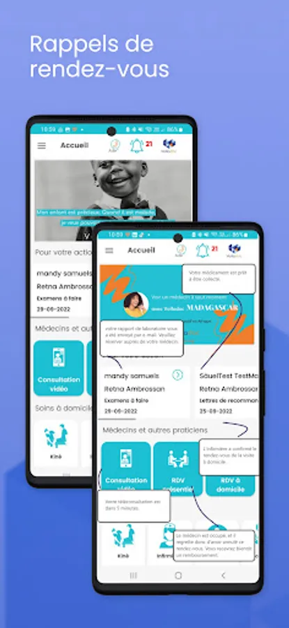 • Prendre un rendez-vous avec un médecin généraliste ou spécialiste pour une téléconsultation immédiate ou différée, pour une visite au cabinet médical / hôpital / clinique, ou pour une visite à domicile d’un professionnel de santé (médecin, infirmier(ère), physiothérapeute, sage-femme).
