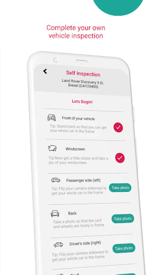 * Self-inspection - take photos of your car yourself and submit them to us from the app, without having to drive out to an inspection centre