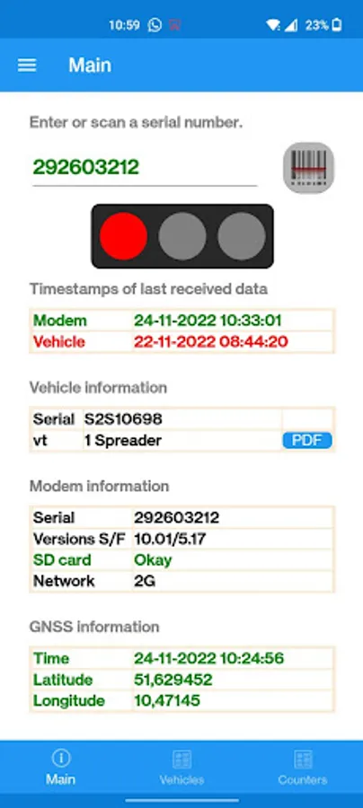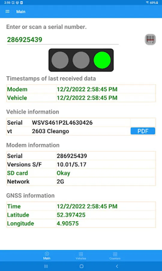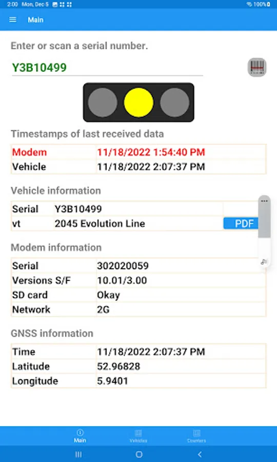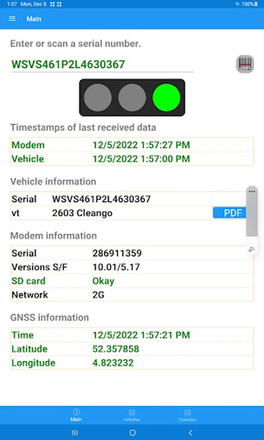 With this app mechanics/support can check if the RTCU is configured OK and if it is in good working order. Information is provided about vehicle type, connected vehicle, SD-card status, connection to server etc.
