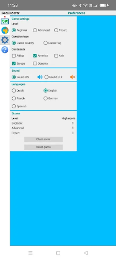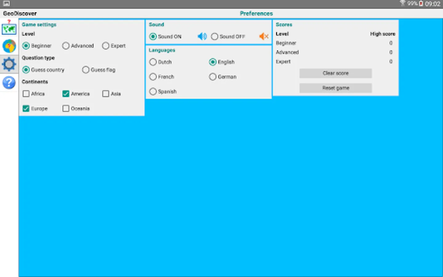 In addition to these main functions, a preferences section allows you to select a different language. You can choose between English, French, German, Spanish and Dutch. You can also switch the sound off or on and keep track of the highest scores for the different levels.