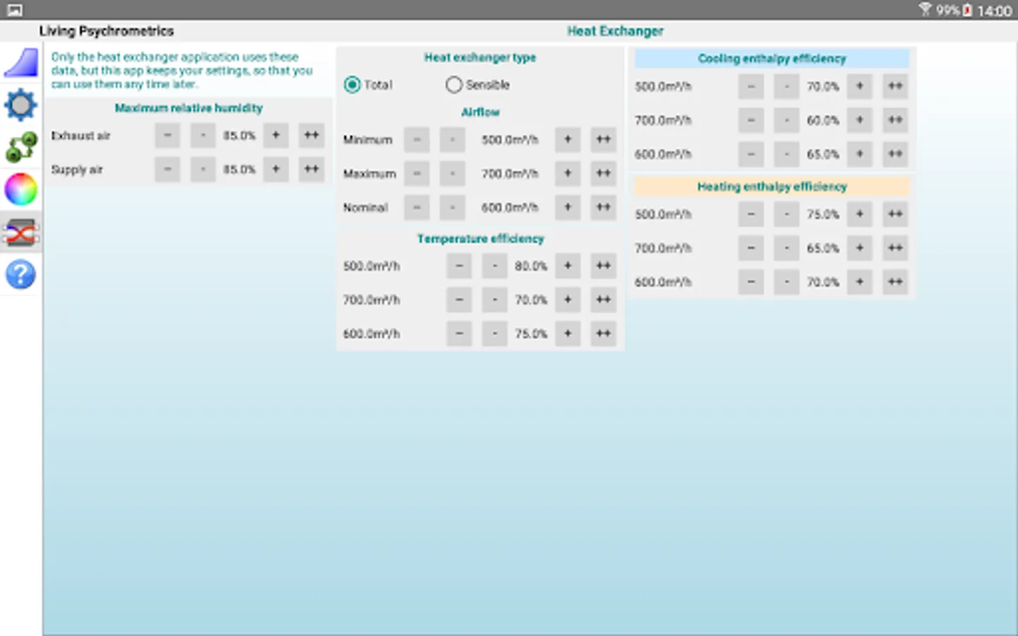 Calculates how warm room air heats up cool ambient air before supplying it as fresh air to the room. While heating up the ambient air, the heat exchanger cools down the room air, which may result in condensate. When the ambient air would be too cold, this calculation dimensions an electric heater to prevent condensate.