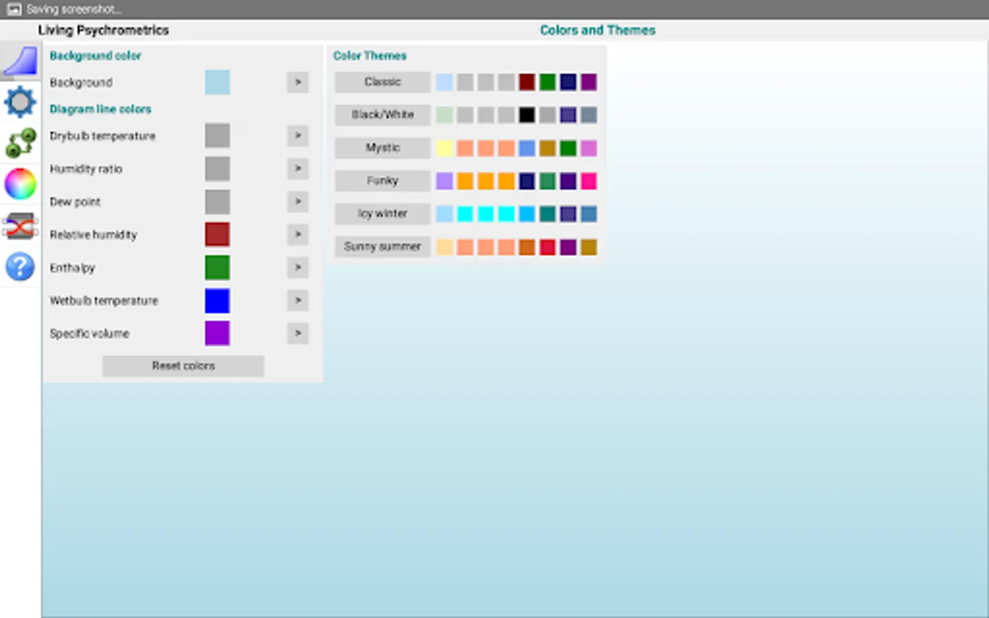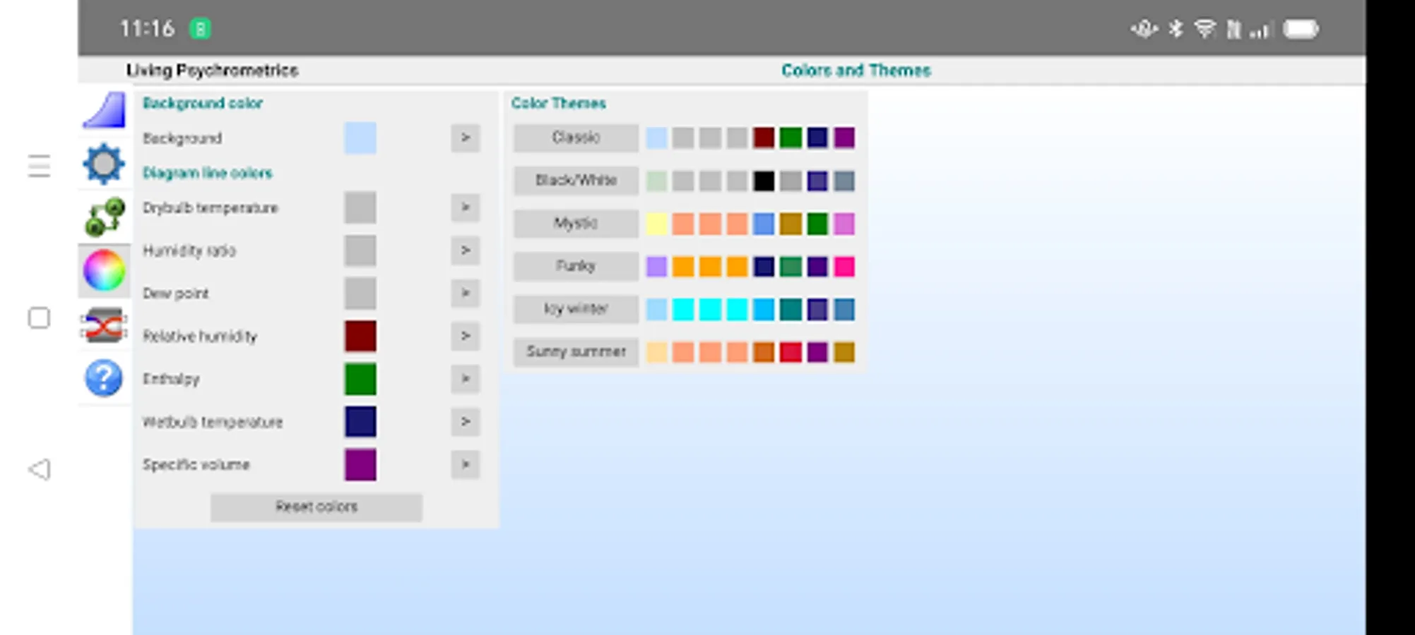 - Choose one of the diagram types (Psychrometrics, Mollier or Dewpoint) for the graphical results. Hide some constant lines on the selected diagram to simplify it. Define colors for the diagram lines and the background gradient.
