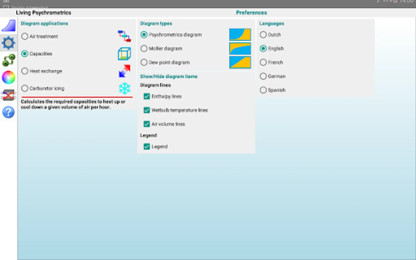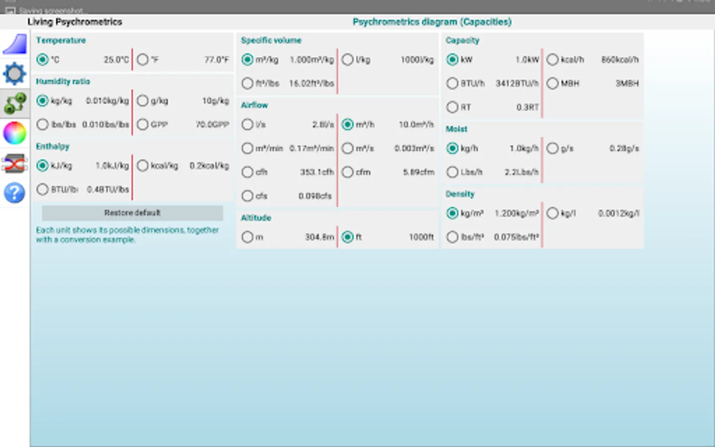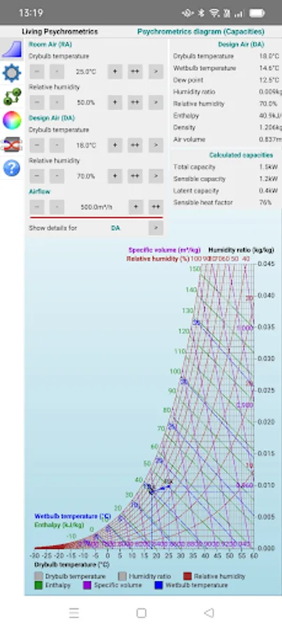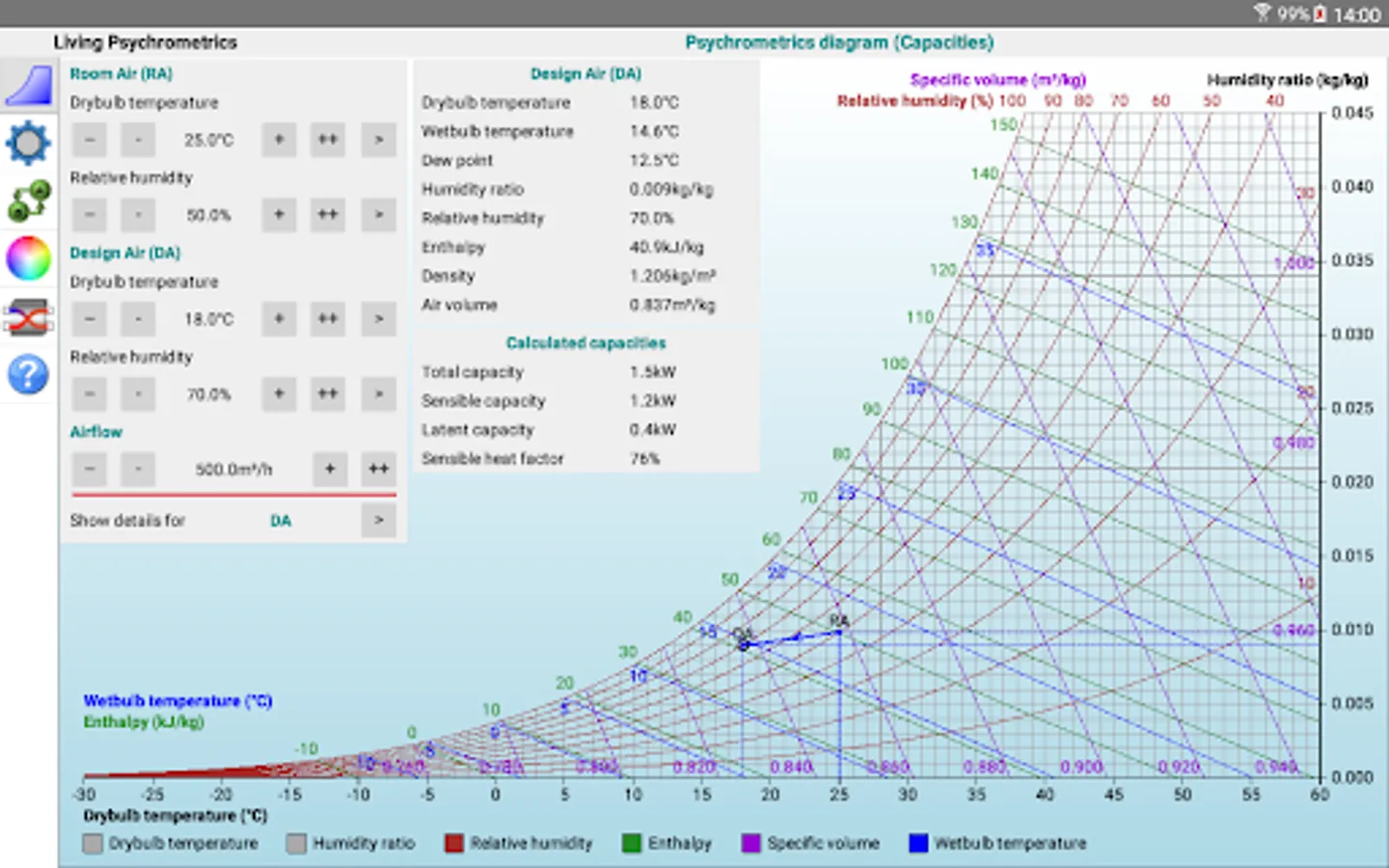 This app offers four different calculations and shows the results both in a pane and on a psychrometric diagram: