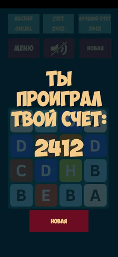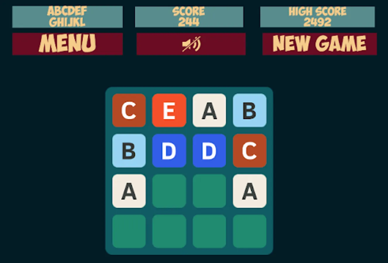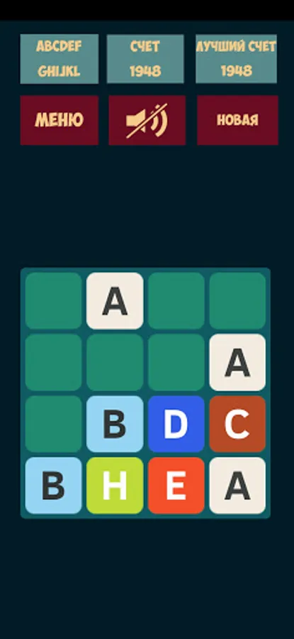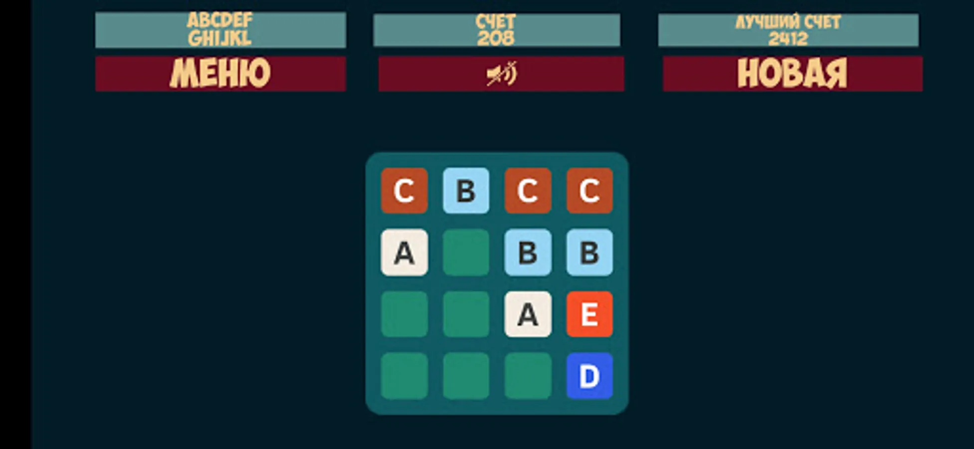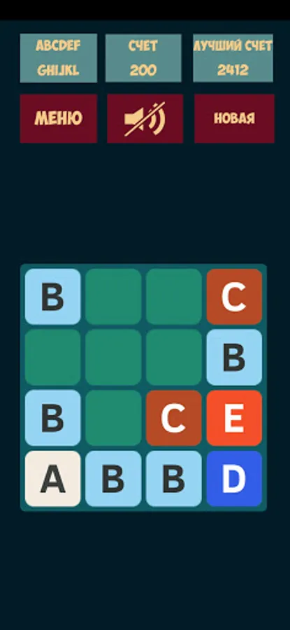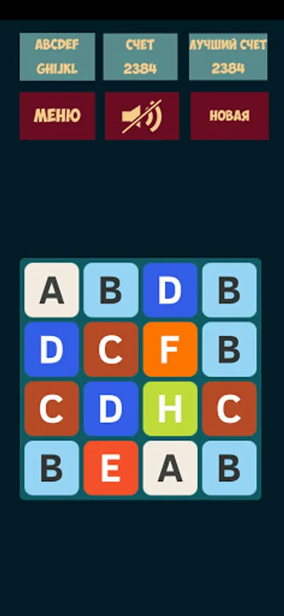 Puzzle game ABCDEF, an improved version of 2048. Move tiles and match them to reach 2048 points.