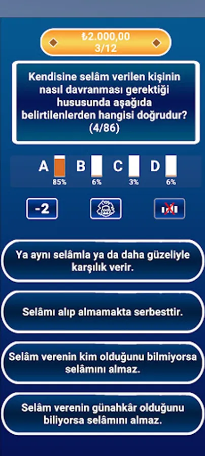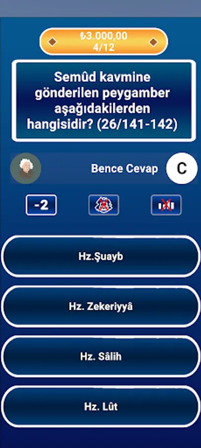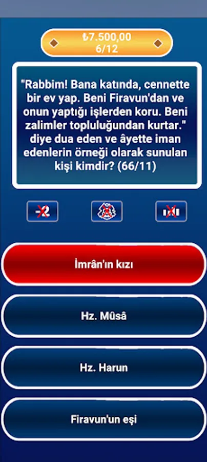 In this application, questions will be asked from the verses of the Holy Quran, our book of life. The answers you give will both measure your knowledge about the Holy Quran and enable you to learn the Quran, our book of life, better. This application was made entirely for God's sake. There are no advertisements or in-app purchases in this application. There may be missing or incorrect questions in the application, and we may encounter errors because they are made by one person. You can help us improve the application by reporting bugs to us. Application: You have 3 wild card rights. I recommend that you try to get to the last question without using jokers to test your knowledge.