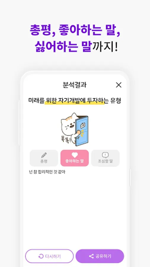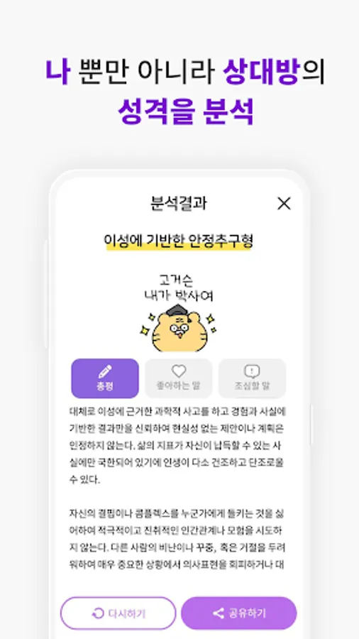 This service is an artificial intelligence program that analyzes the writing written by an individual using the domestic and internationally unique writing psychological analysis algorithm developed by Sentensol Co., Ltd. and provides the result of the person's personality and disposition. It is a technology that provides an image that represents a personality, a general evaluation of the personality, words you like to hear, words you don't like to hear (words to be careful of), and the algorithm used in this service approaches the essence of a person's inner side It is a technology that analyzes content and patterns, structure and form, and flow of thought. It is a program created by applying more than 100 logics, such as the characteristics of selected vocabulary, word order, spacing, punctuation, and omitted areas. In addition to the results provided by this service, this technology can analyze individuals' learning tendencies, shopping tendencies, career and career choices, and points to be careful about in terms of health. It can be used for trauma discovery and emotional healing such as depression, autism, and attention deficit disorder, and since it can be applied to other languages, an English version will also be developed and distributed in the future.