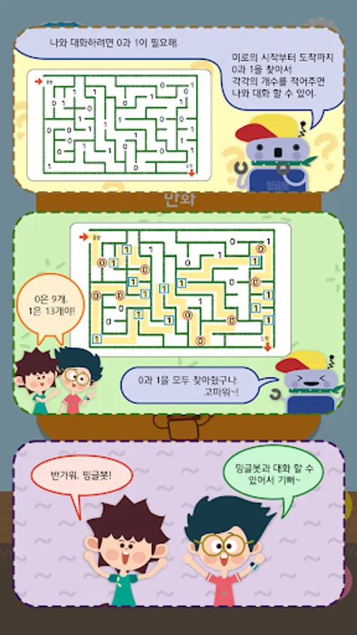 Minglebot AI Junior is a gamification that can improve computational thinking ability to express pixels based on topics such as finding 0 and 1, and to experience the principle of binary. It is an interactive app that gamifies the principles and concepts of pattern recognition, decomposition, abstraction, algorithm, debugging and application, which are the concepts of computational thinking.