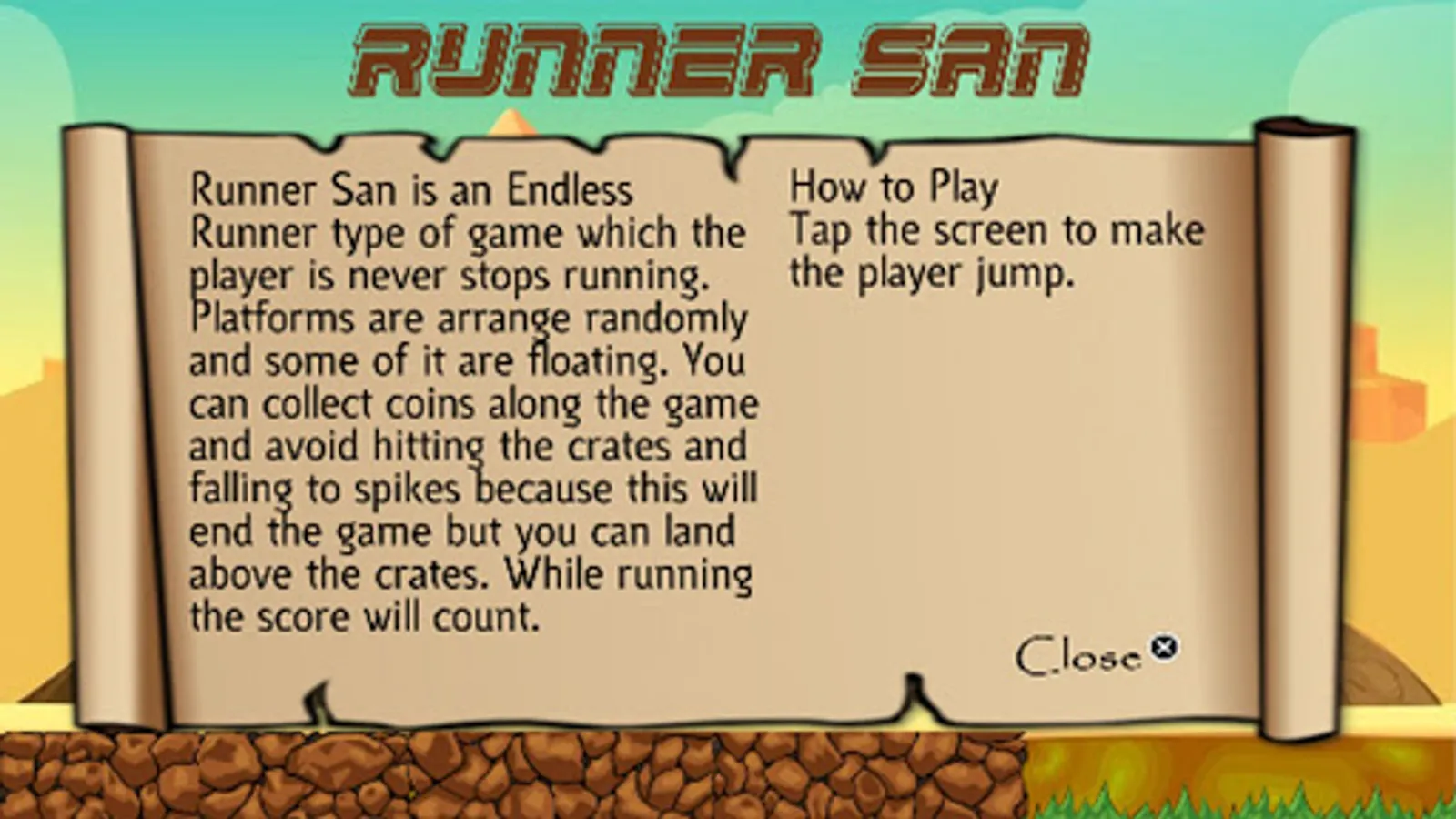 Runner San is a type of Endless Runner game that the player never stops running. The platforms are randomly organized and some of them are floating. You can collect coins throughout the game and avoid hitting the boxes and falling into spikes because this will end the game, but you can land on top of the boxes. While the score is running it will count.