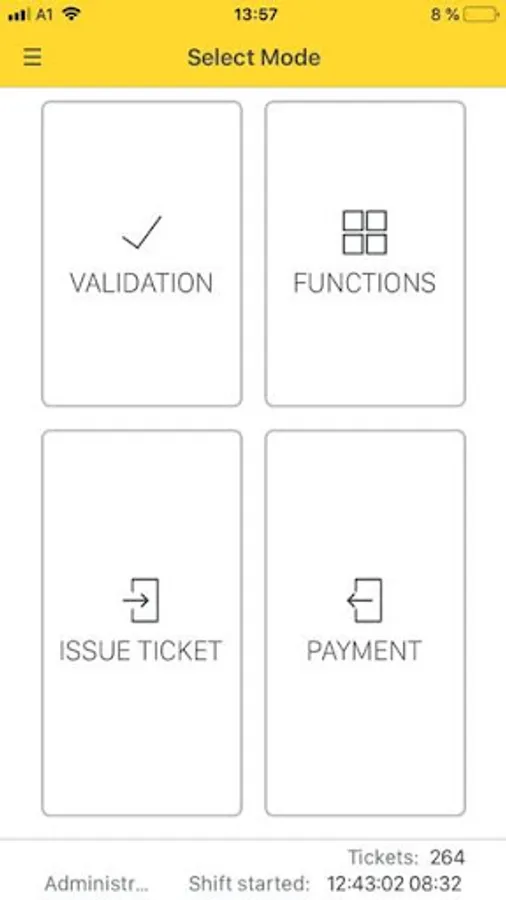 • Cashier mode: scans barcode tickets, handles payment and issues receipts.