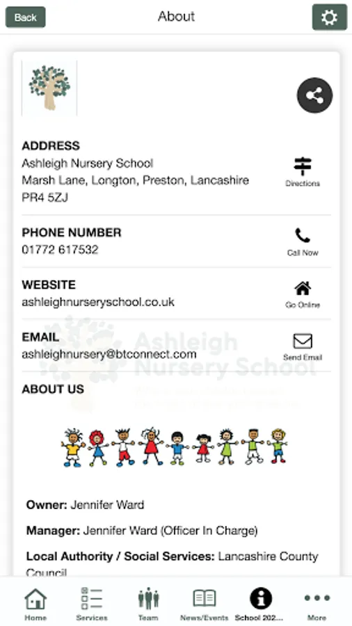 Owner: Jennifer WardManger: Jennifer Ward Local Authority / Social Services: Lancashire County CouncilNumber of Staff: 24Service Offered: Day Nursery (Privately Owned), Open all year, Full Day CareTotal Places for Children: 72Age Range: from 6 months to 5 yearsOpening Days: Mon-FriOpening Hours: 0745-1730When Closed: 1 wk Christmas