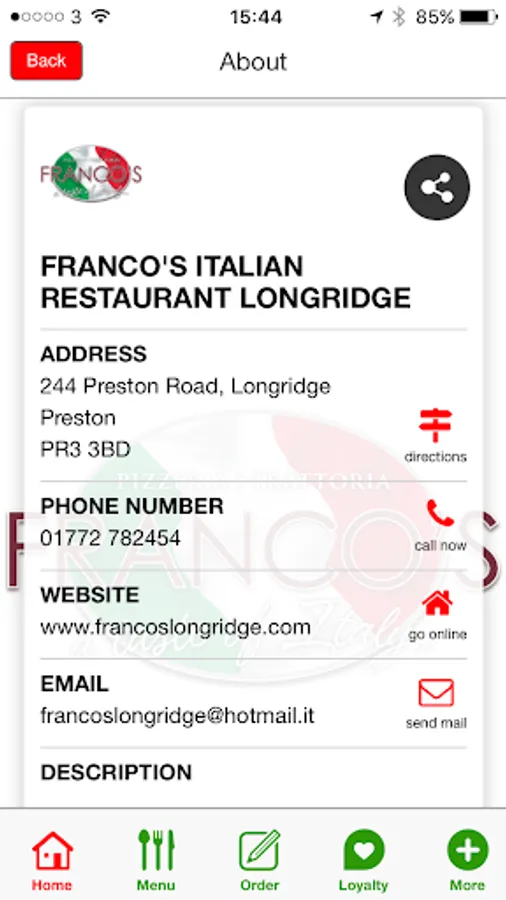 Franco's Restaurant has been in business more than 30 years and in that time owners Luigi and Barbara have built up a loyal and regular clientele. It's located on the outskirts of Longridge, near Preston, in a large, detached building with plenty of car parking space. Recently refurbished to a high standard, Francos restaurant of longridge has a large new bar area at the front with comfortable sofas and an open fire in winter while the restaurant to the rear can accommodate up to 145 people. It's a warm and inviting dining space with a low, beamed ceiling, stone walls bedecked with all manner of artefacts, an open kitchen and the odd statue adding a classical touch. The menu covers all the pizza and pasta favourites along with plenty of a la carte mains including steaks and their signature Francos lamb. Families are very welcome and there are plenty of special deals if you are watching the pennies. In short, Francos restaurant is a warm and friendly Italian that's well worth the drive through the countryside to get there.This app allows you to download menu, receive push messages on special offers, provides a loyalty stamp card with a free offer, share the app with friends and family, integrated with Facebook, Tripadvisor and allows you to calculate cost of meal useful with a large party.