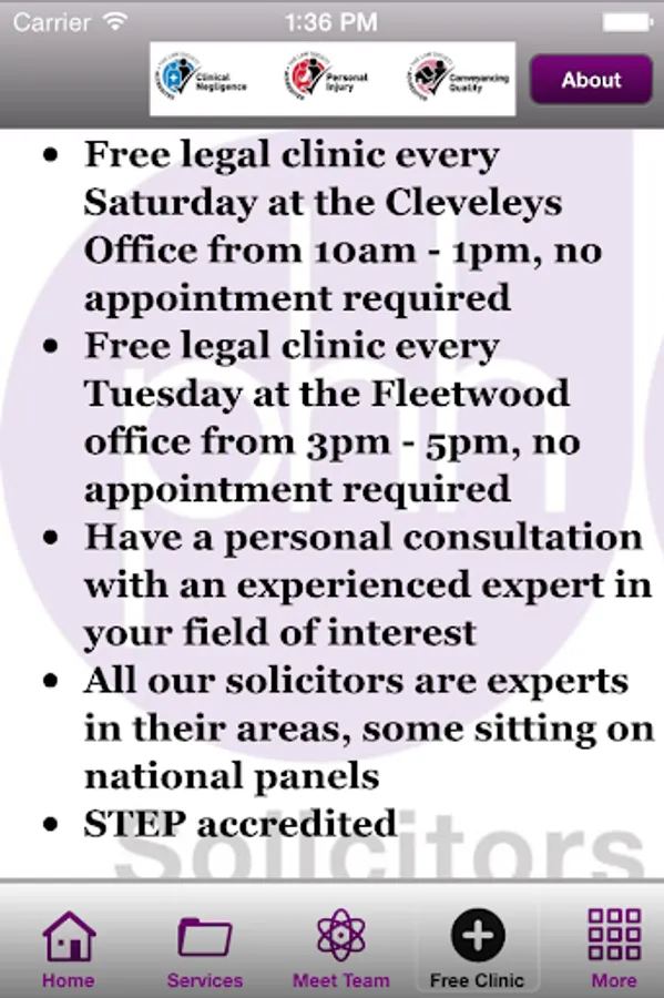 We provide fixed fees within our employment and family departments with free initial consultations in all of our specialisms together with free legal clinics on Tuesday between and 3.00. p.m. and 5.00. p.m. at our Fleetwood office and 10.00. a.m. to 1.00. p.m. at our Cleveleys office.