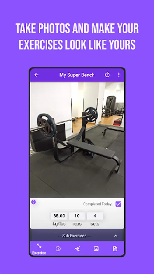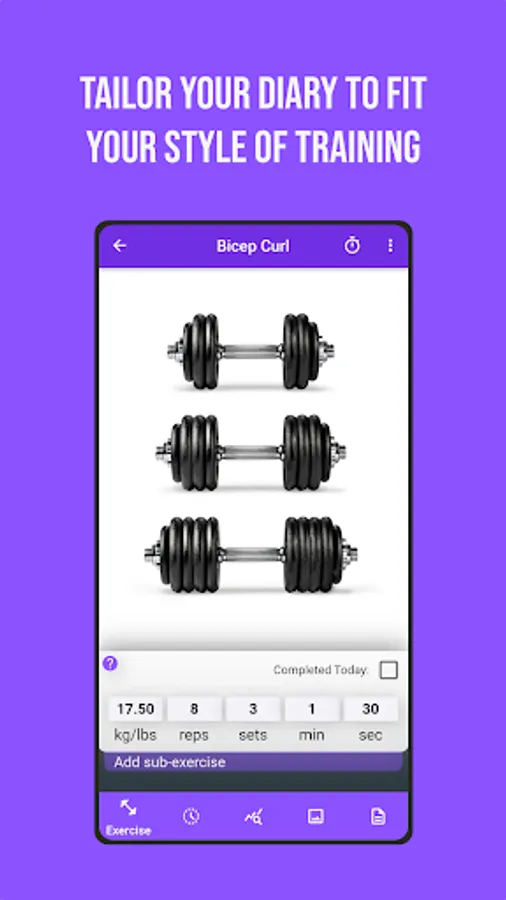 Add workouts and exercises, name them as you wish and add photos to personalize your diary.