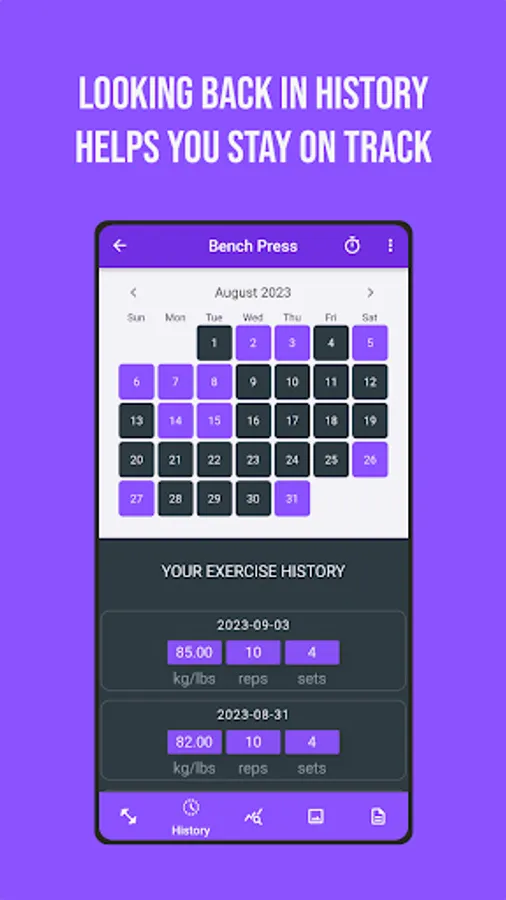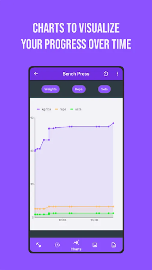 Track weights (kg/lbs), repetitions, sets, minutes and/or seconds in each exercise. View history and charts of your completed exercises.