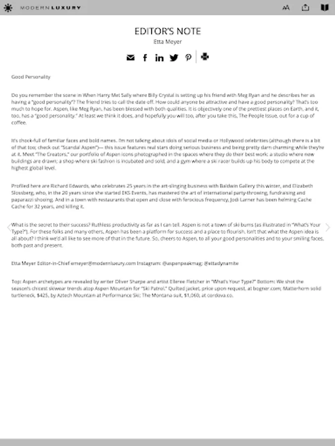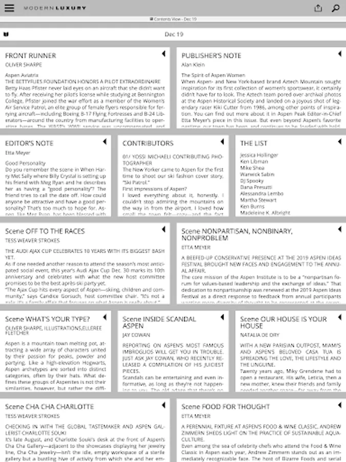 The Modern Luxury Aspen Peak app delivers Colorado living at its finest, from fashion, dining and nightlife to culture, entertainment and beauty. Covering the hottest mountain town where the affluent flock, Aspen Peak magazine continues to entice readers with provocative content.
