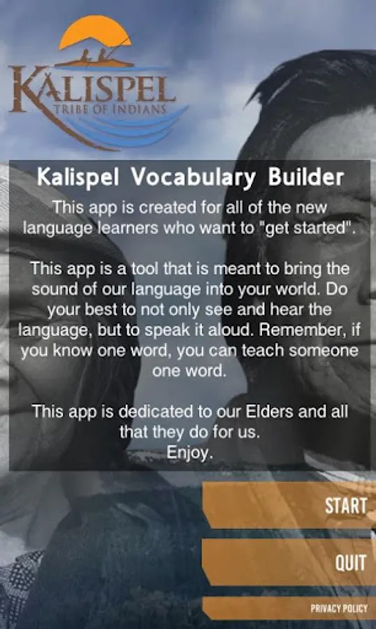 This app is a tool that is meant to bring the sound of our language into your world. Do your best to not only see and hear the language, but to speak it aloud. Remember, if you know one word, you can teach someone one word.