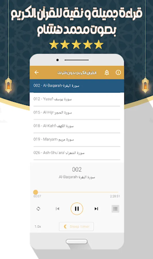 And if you are a fan of listening to Sheikh Muhammad Hisham in reciting the Noble Qur’an, the application of Muhammad Hisham - Quran without Net provides you with listening to the surahs of the Noble Qur’an in the voice of Muhammad Hisham mp3 for free.