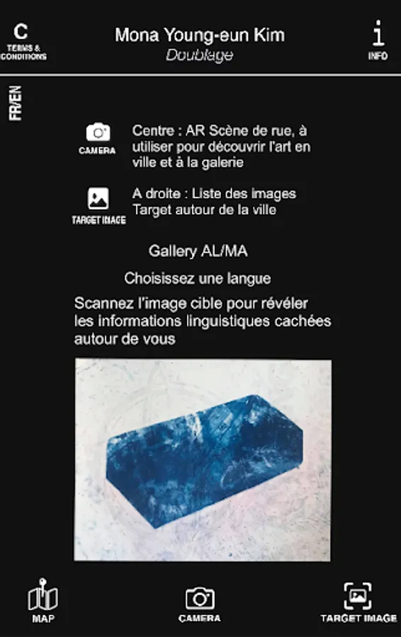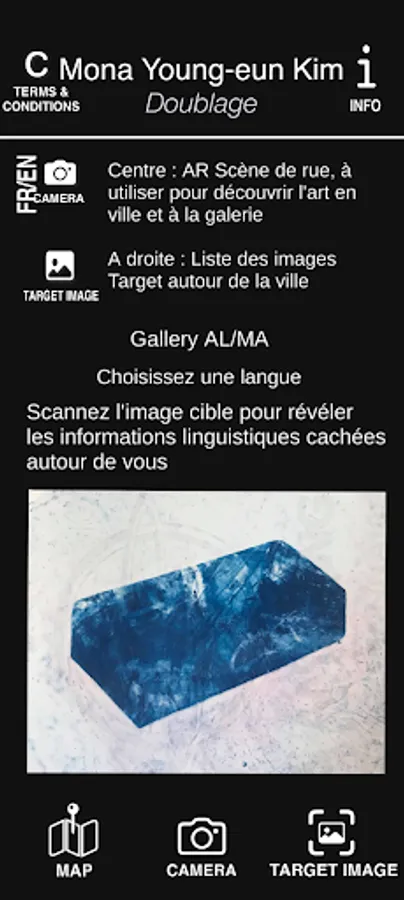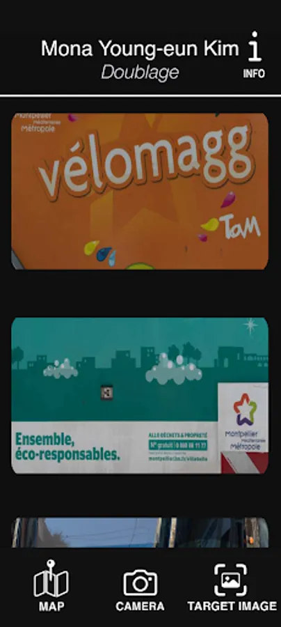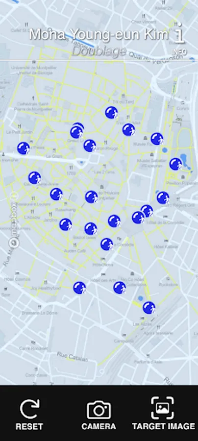 This augmented reality app is part of an art project by Mona Young-Eun Kim, which takes place in Montpellier, France. It seeks to project information into digital space and disrupt visual information in the real world.