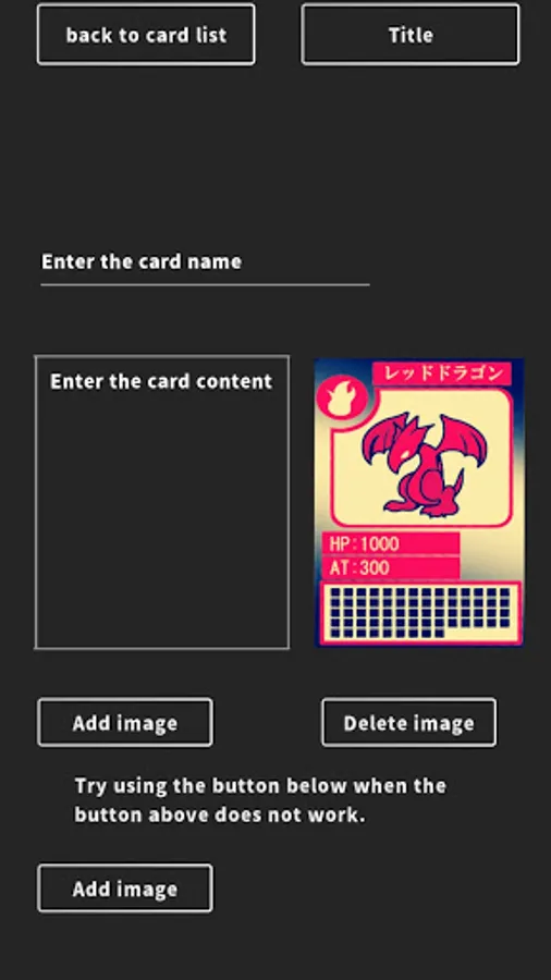 You create your own card by putting the information on the card and inserting an image. You can then use the cards to create a deck and play with the deck you have created.