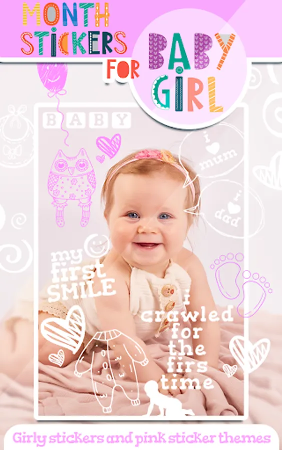 Month Stickers for Baby Girl is a great photo editor for parents to create your photos with milestones stickers for each week or month! Find one month baby milestone stickers or baby milestone from birth to 12 months. Follow your little girl baby development and look how fast your baby grows. Child development is so exciting! It's always interesting to see when your baby crawls, when laughs or makes first steps. Capture all these precious moments with your baby camera and embellish them with month stickers for baby girls. Create amazing photo montages with your favorite pics. Make funny photos with 6 month milestones or 4 month milestones. These developmental milestones stickers are a perfect way to make a cute baby album which is an everlasting memory. If you like newborn baby games and all the apps designed for babies, you will definitely adore this photo editing app for baby girls.