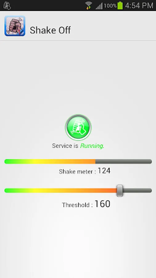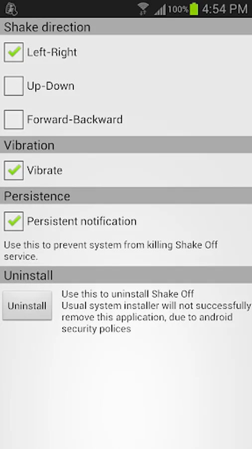 Using "Persistent notification" option, guarantee that system will not turn off Shake Off service when it needs memory, in most cases you will not need to use this
