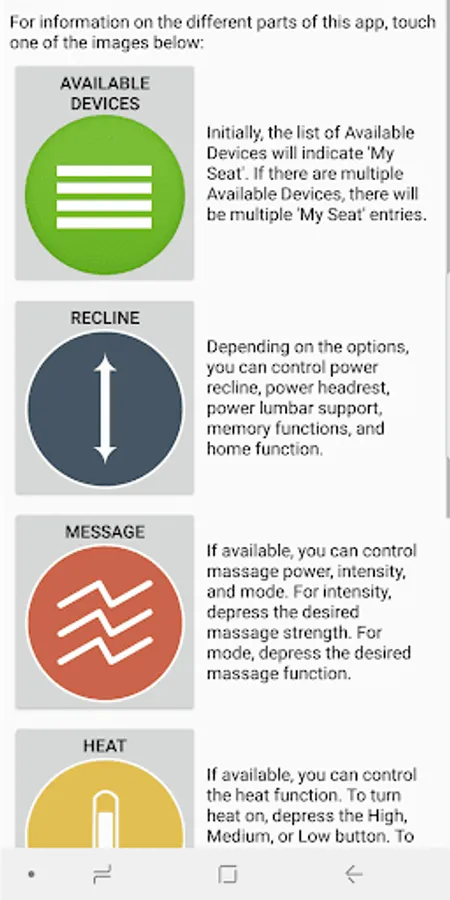 The APP allows you to connect to your enabled furniture via Bluetooth from your phone or tablet. Depending on the options, you can control the electric motors that move your chair or sofa and may include power recline, power headrest, power lumbar support, memory functions, home function, light, cooling cup, heat, and message. Requires Android Lollipop 5.1 or later