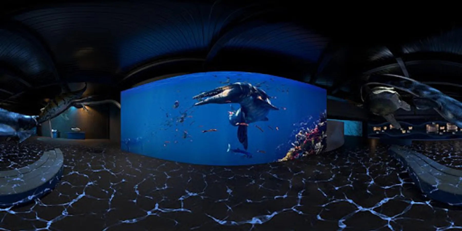 Habitat stagings with dinosaur models up to 12 meters in length present three-dimensional moments from a country before our time. Europe's largest digital and first real-time realized "palaeo aquarium" creates a lasting, tangible spatial experience on over 50 projected square meters. Both the 3D-animated "main actors" and the 1: 1 models of the original reptiles were developed on the basis of the latest scientific research results especially for the exhibition project of paleontologists.