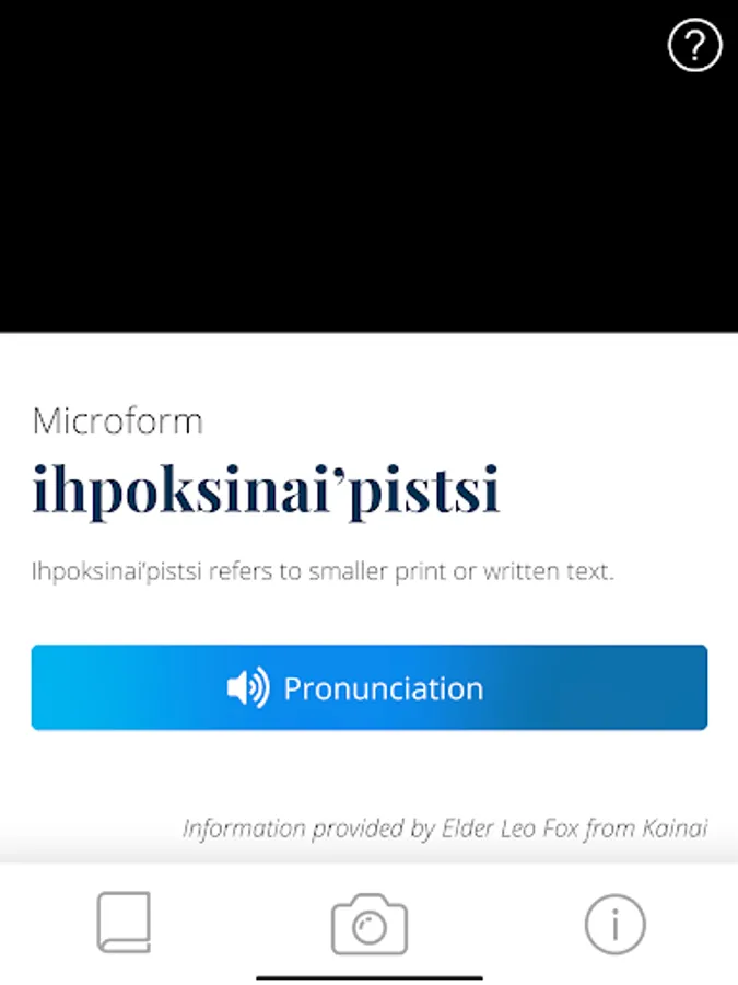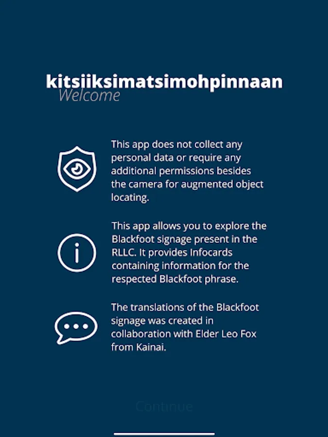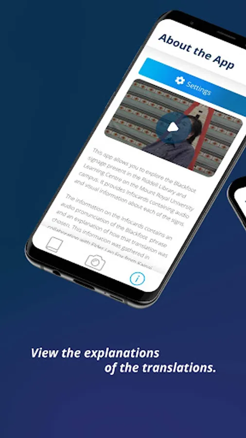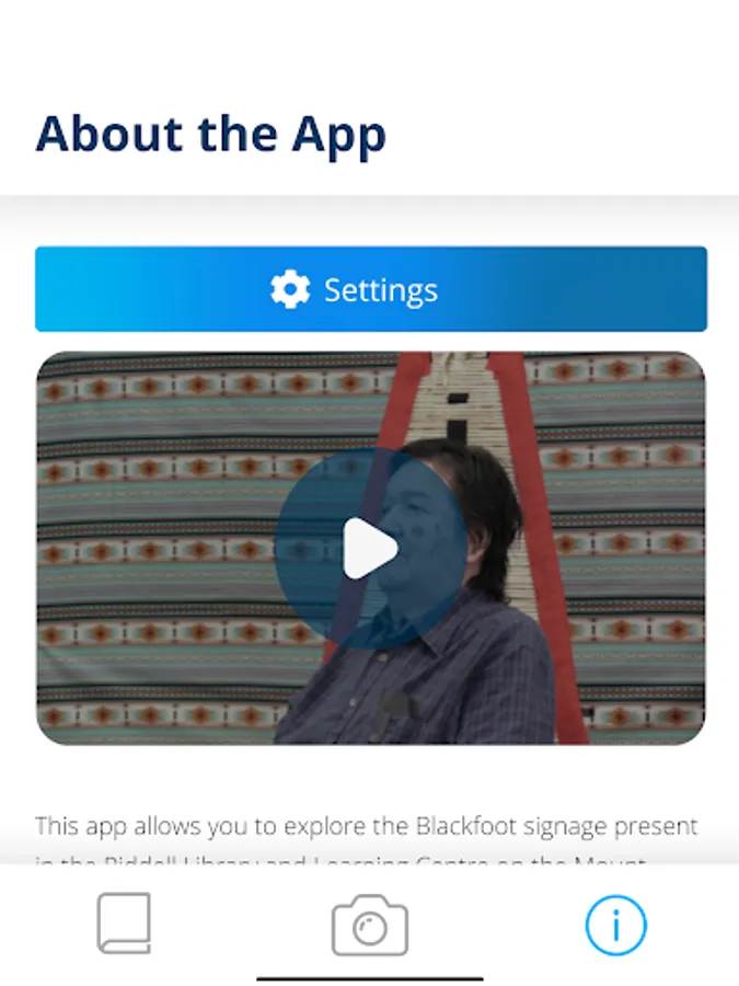 DeciphAR uses Augmented Reality to provide audio and visual information about the Blackfoot signage, translated by Elder Leo Fox from Kainai, in the Riddell Library and Learning Centre (RLLC). The audio information includes the pronunciations of the Blackfoot phrases present on the signs. Also, each Infocard contains an explanation of the translation. Users can scan the signs in the library to access these Infocards, once found the information is accessible through the list. To test their knowledge users can try the quiz.