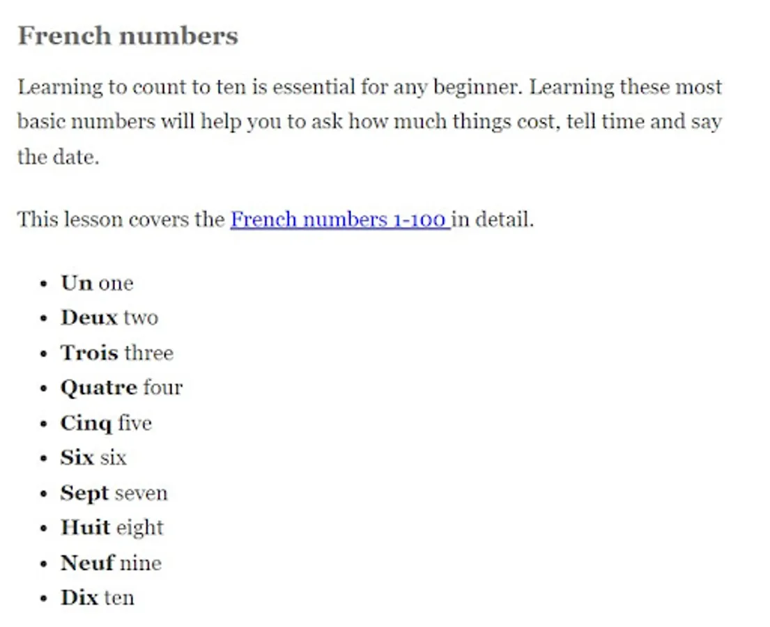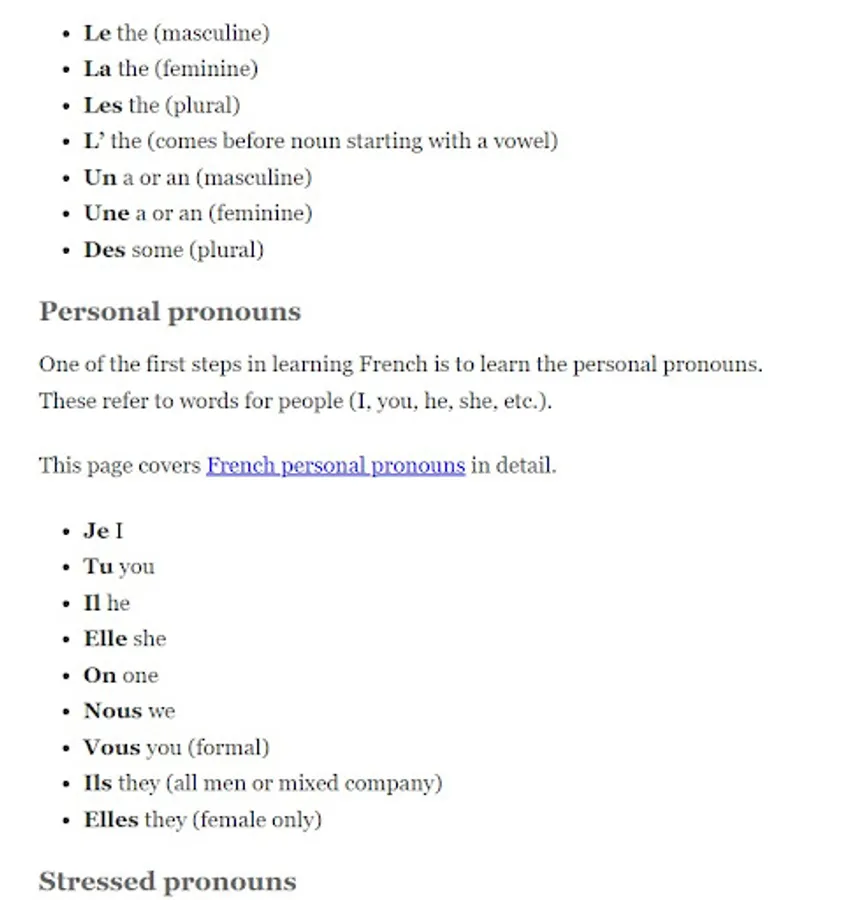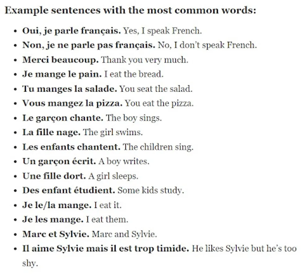 Oui (yes), non (no), merci (thank you), je (I), tu/vous (you), le/la/les (the), un, une des (a, an and some), le/la/les (it, them), et (and) and mais (but).
