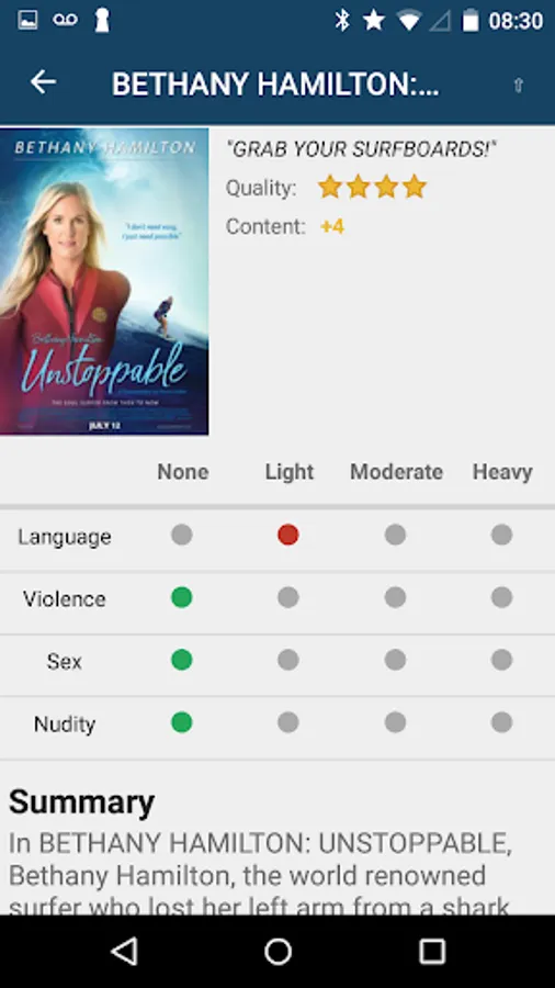 • Review overall movie content and detailed ratings in four categories (language, violence, nudity, sex)