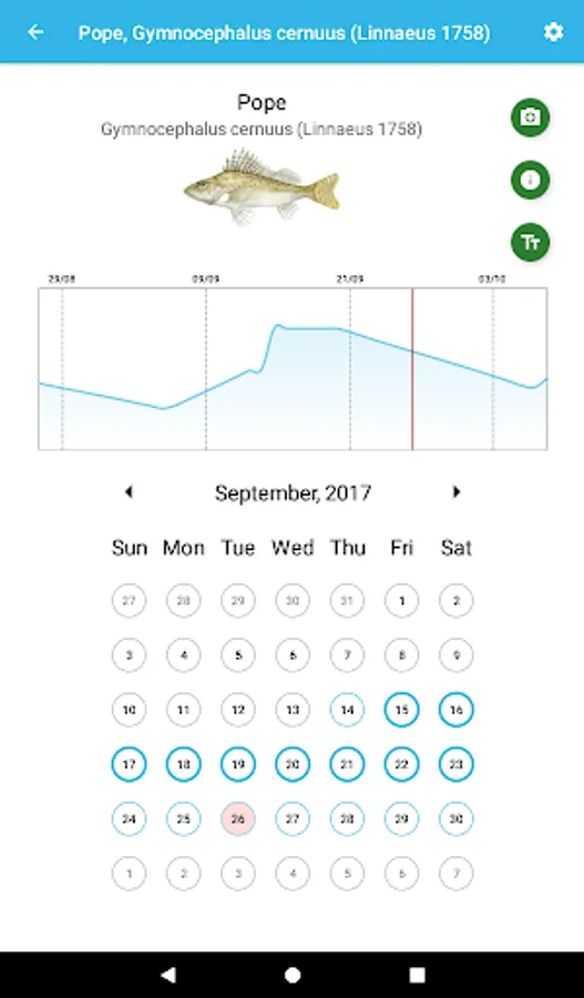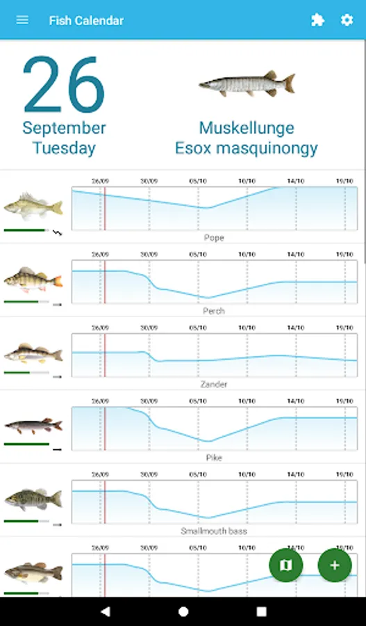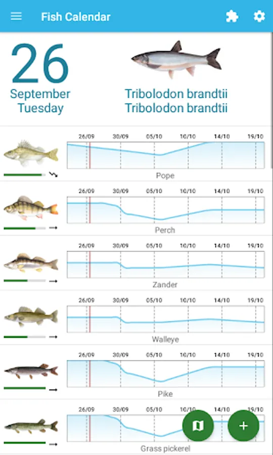 For convenience of display, you can choose to only desired fish species, disabling forecast for that types of fish that you are not going to catch soon. Fishes are distributed by families in App settings.