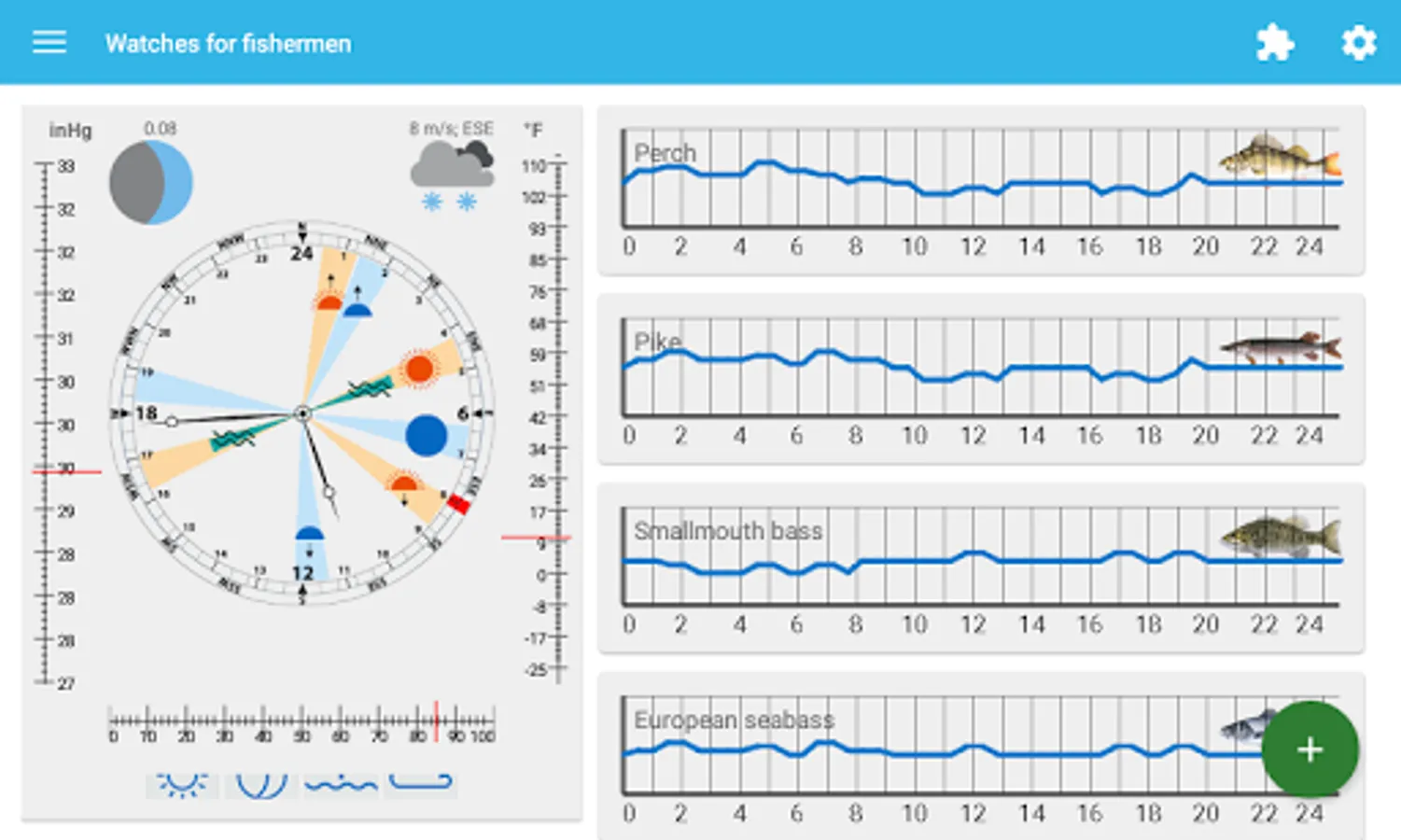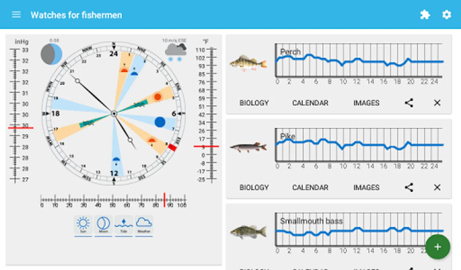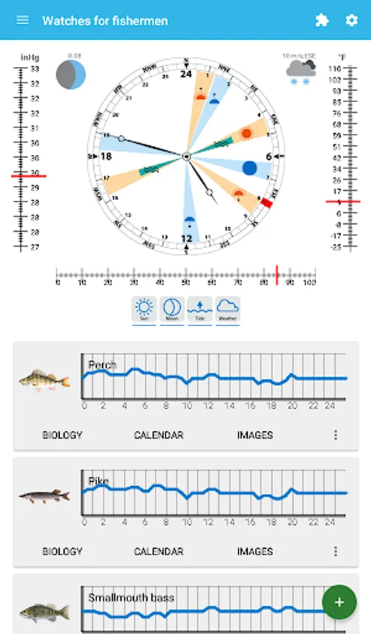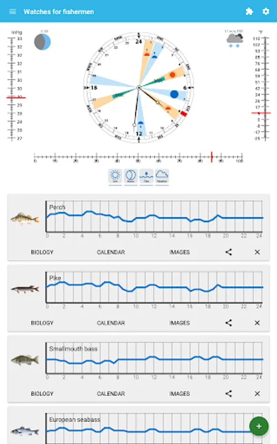 The user can choose what factors he considered when forecasting.With the help of the switches that are on the screen, you can disable the influence of the Sun, moon, tides, weather and even the daily behaviors of the selected fish species. In this case, will stay only the data of seasonal behavior of fish for those coordinates where is the phone.