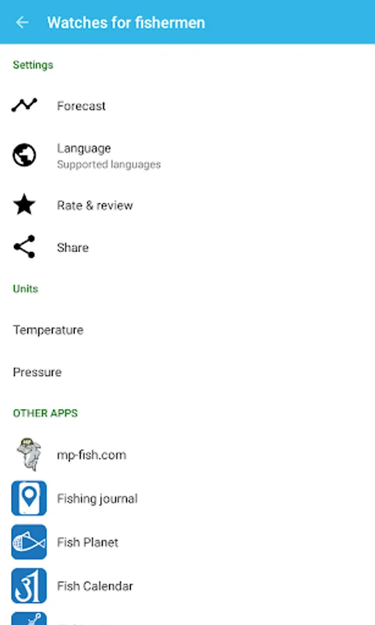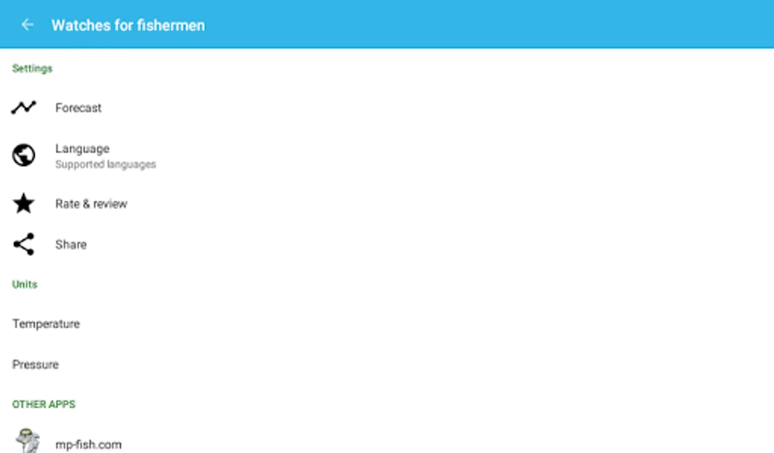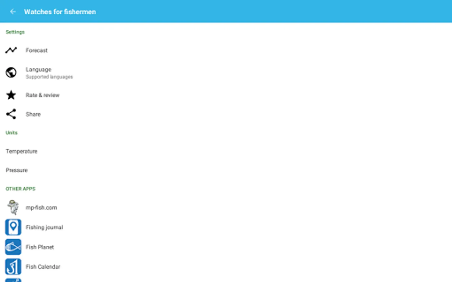 The user can choose what factors he considered when forecasting.With the help of the switches that are on the screen, you can disable the influence of the Sun, moon, tides, weather and even the daily behaviors of the selected fish species. In this case, will stay only the data of seasonal behavior of fish for those coordinates where is the phone.