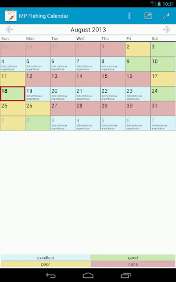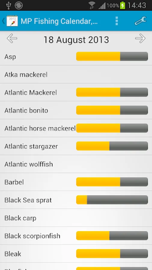 List of species of fish, which is based on your personal calendar can be customized.