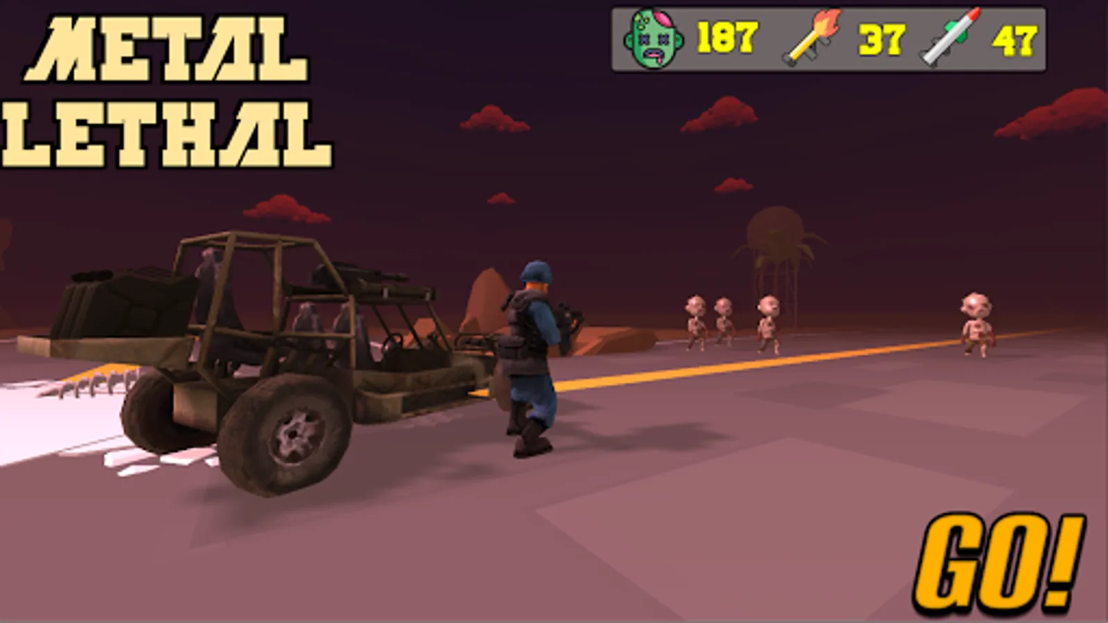 Lethal Metal is a crazy driving, blasting and shooting game centered around an army of mercenaries trying to save their blood brothers by completing their mission to find a vaccine against zombie virus infection, save the world, then go home and rest.