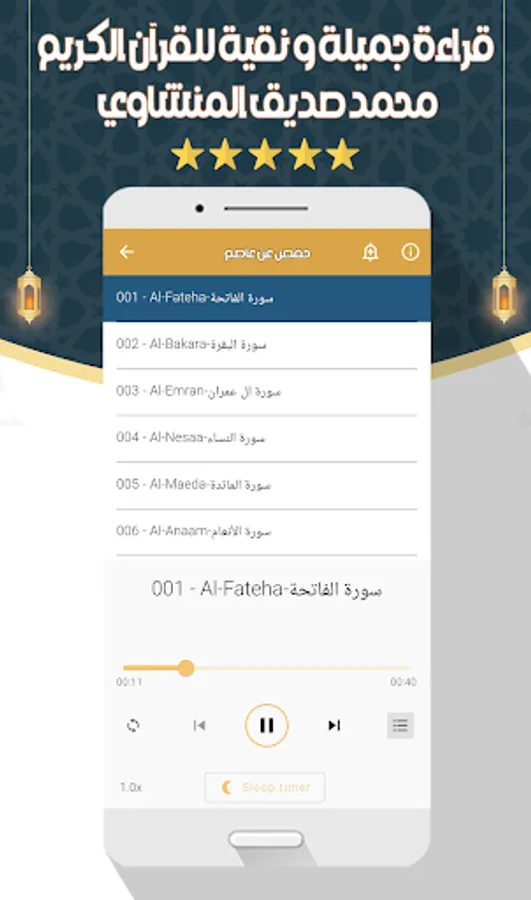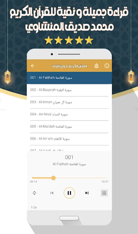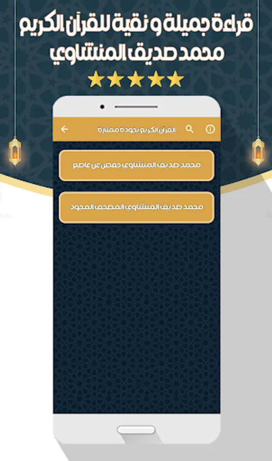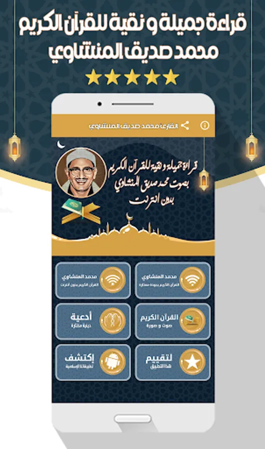 The application of the Noble Qur’an with the voice of Muhammad Siddiq Al-Minshawi allows you to hear all the surahs of the Noble Qur’an through your phone