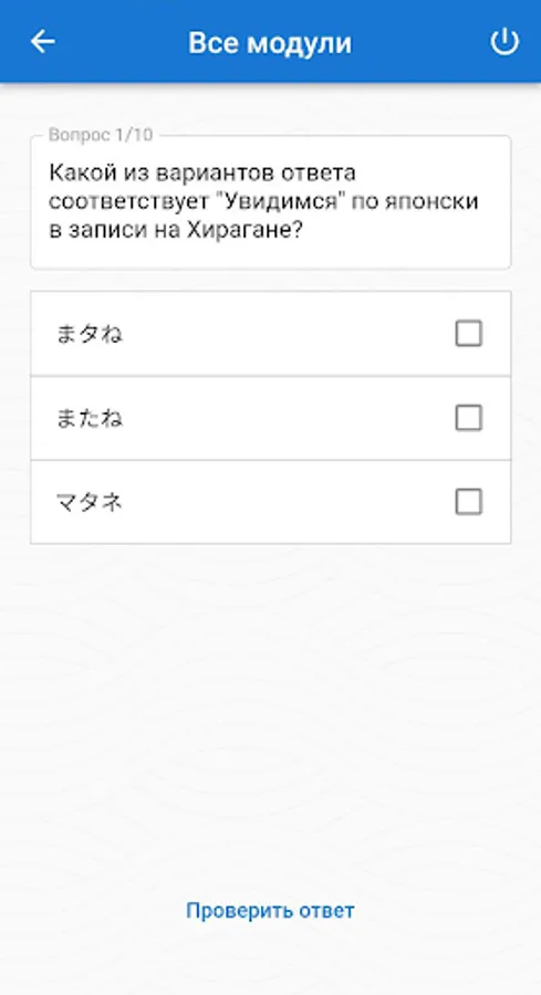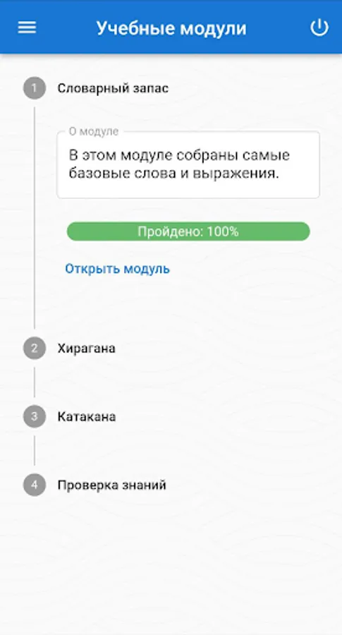 The application is designed to make it easier for beginners to dive into the study of the Japanese language. It consists of 4 training modules, which are recommended (but not required) to be completed in order.