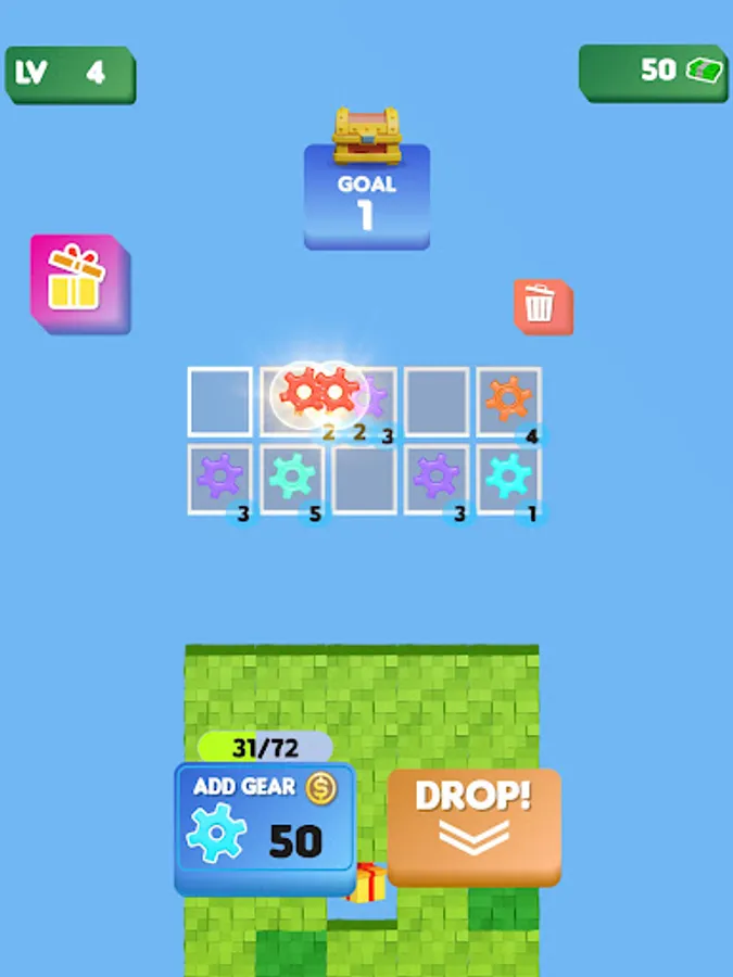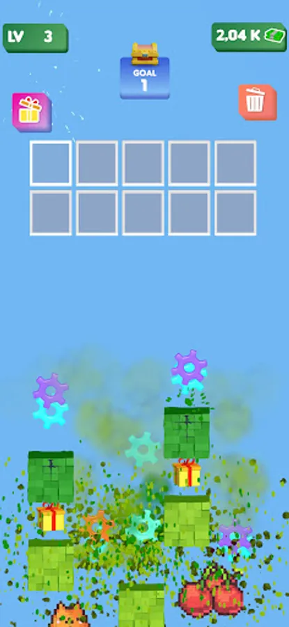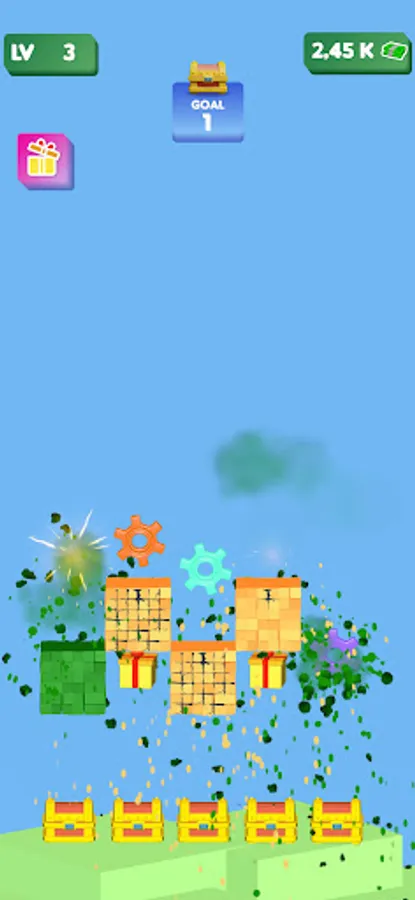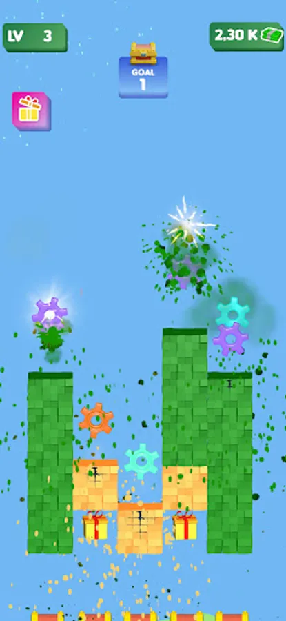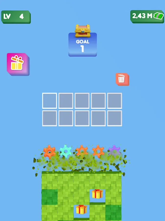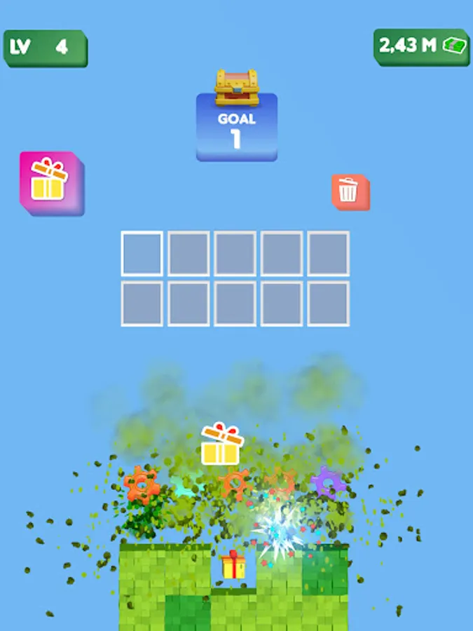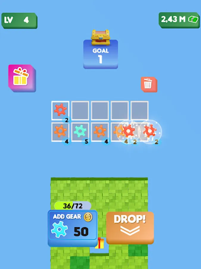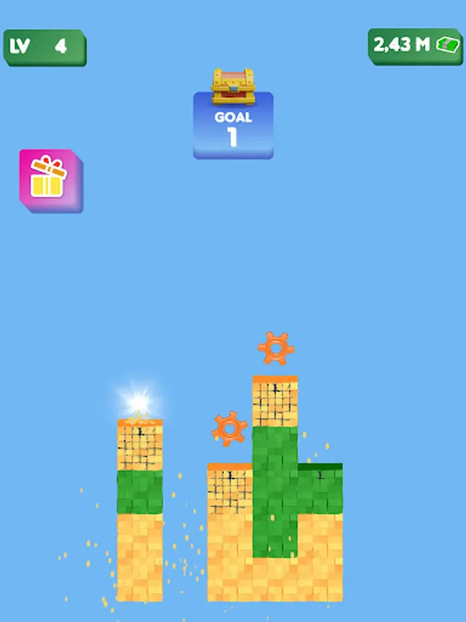 Gain money by destroying blocks, spend your money to buy more cogwheels, merge them for better and stronger ones, acquire gifts, trigger rockets and try to reach the end!