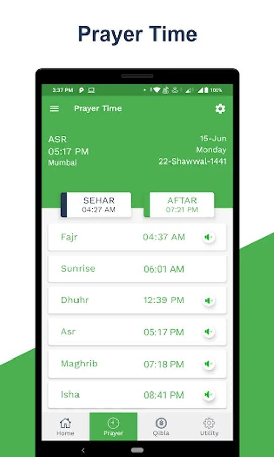 ● In the Namaz tab you can see the time of the current location's prayers.
