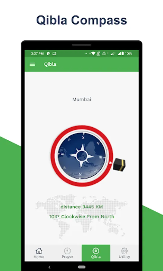 ● In the Qibla tab you can see the direction of the current location of the Qibla.