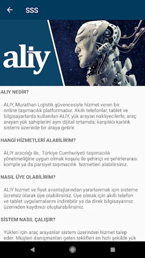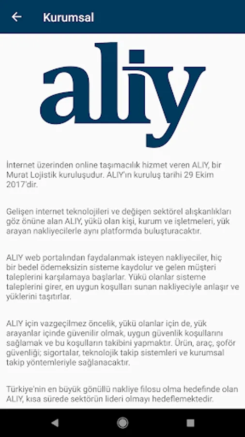 ALIY is an online transportation platform which is assured by Murat Lojistik. ALIY, which is used in smart phones, tablets and computers, with freight forwarders and freighters looking for vehicles in the same digital environment; brings together on the mutual profitability system.
