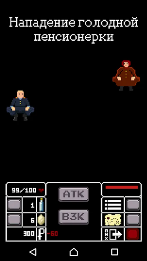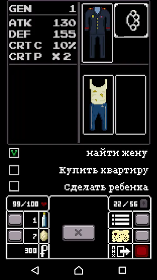 You must go to work (or not?) To earn a wife and an apartment, to continue your race. Do not forget that life time burns at work. Each bottle of vodka increases the attack on one fight, but takes a year of an already short life. If you died in a fight or from old age - you interrupt your race and the whole process is discarded. Earned money and housing are not transferred to the next generation.