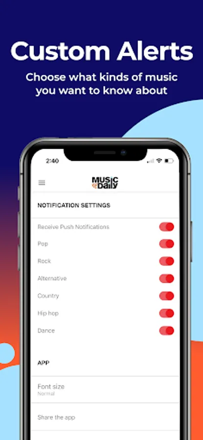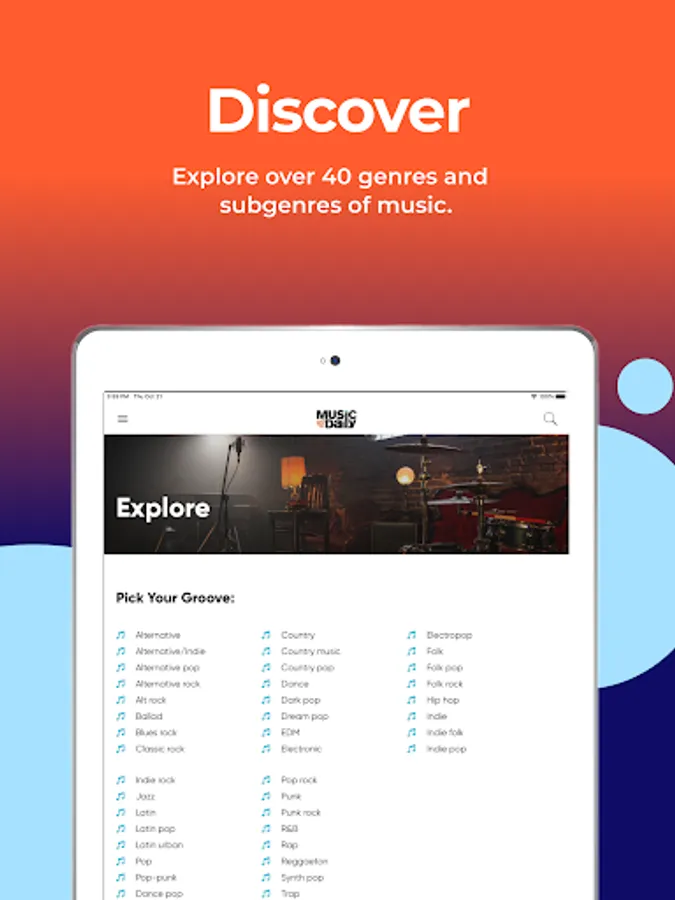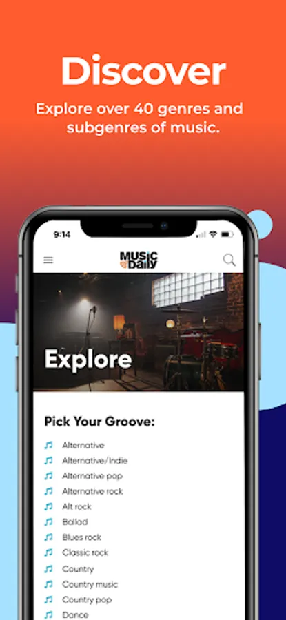 Music Daily's special 'Explore' mode displays over 40 musical genres and sub-genres for endless music discovery.