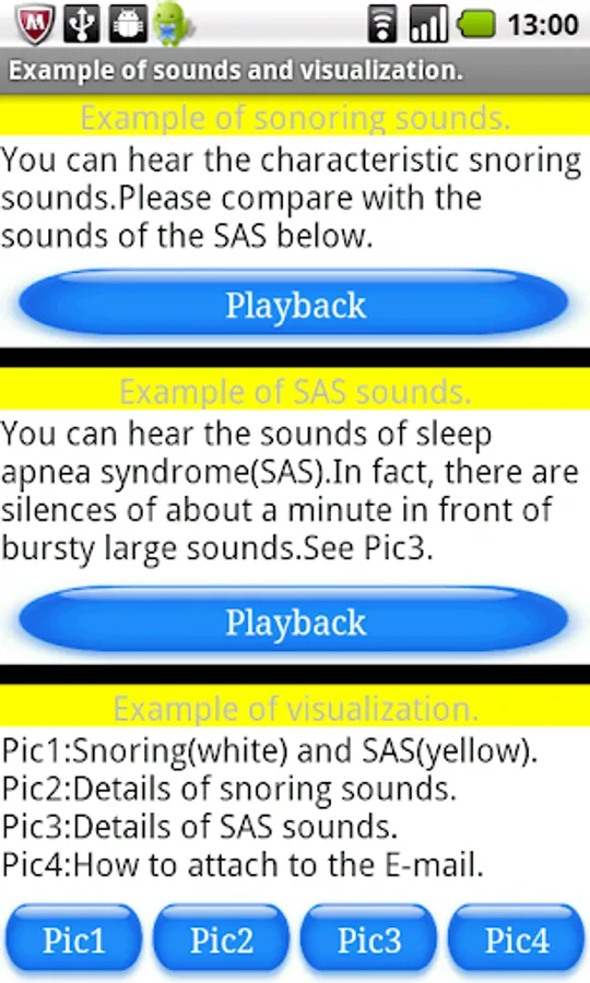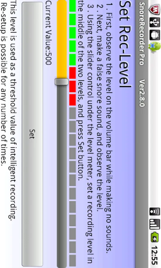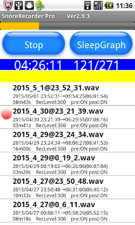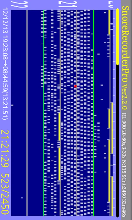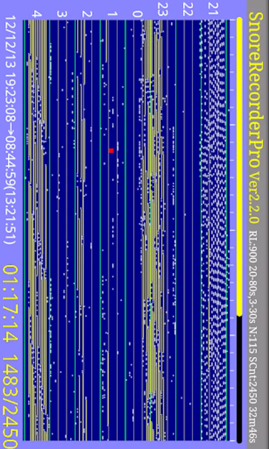 This application is a PCM (WAV) format sound recorder intended to capture sounds (snoring, talking) while sleeping, but it can also be used for other purposes such as recording a voice memo.